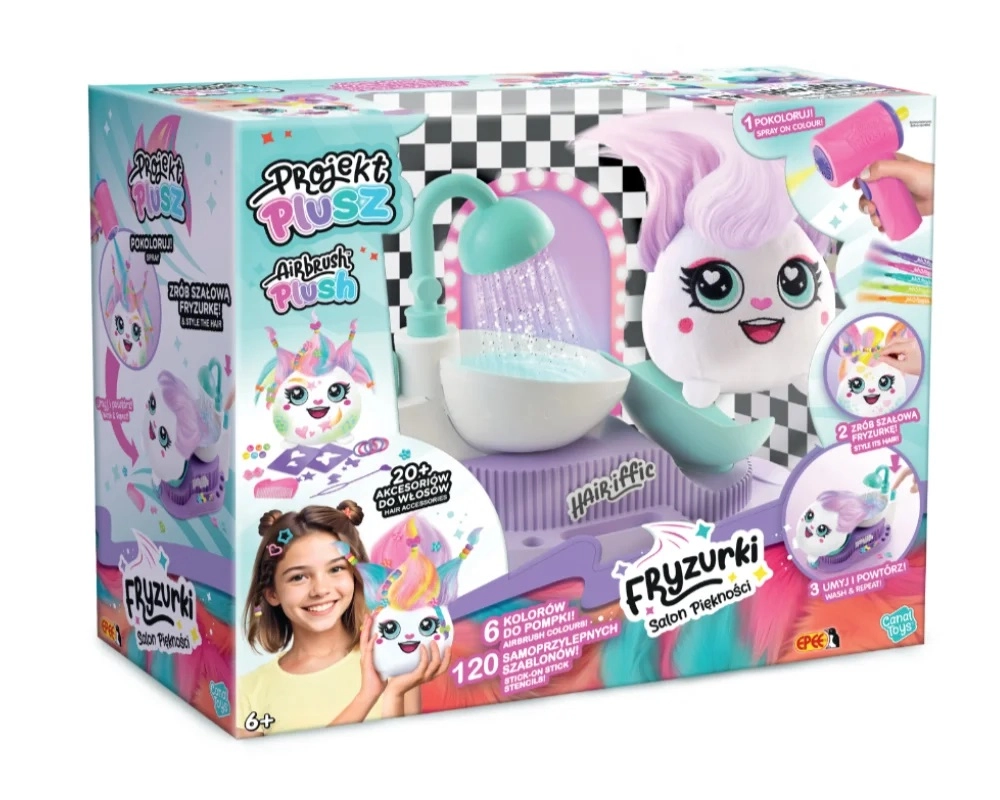 Kreatívna sada Epee Projekt Plusz Fryzurki – Salón krásy prináša deťom všetko, čo potrebujú na dekorovanie a úpravu plyšového maznáčika. Pomocou elektronického airbrushu v tvare fénu a šablón ľahko nanesú farebné vzory, ktoré možno po vypratí úplne zmeniť a tvoriť znova a znova. Umývacia stanica s prúdom vody dodá hre realistický rozmer a naučí deti starať sa o svoj výtvor.