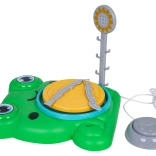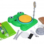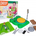 Základňa v tvare žaby, otáčavé koliesko, nožný pedál, lampička, nástroje, farby a 2× hlina – všetko na okamžité tvorenie a maľovanie.