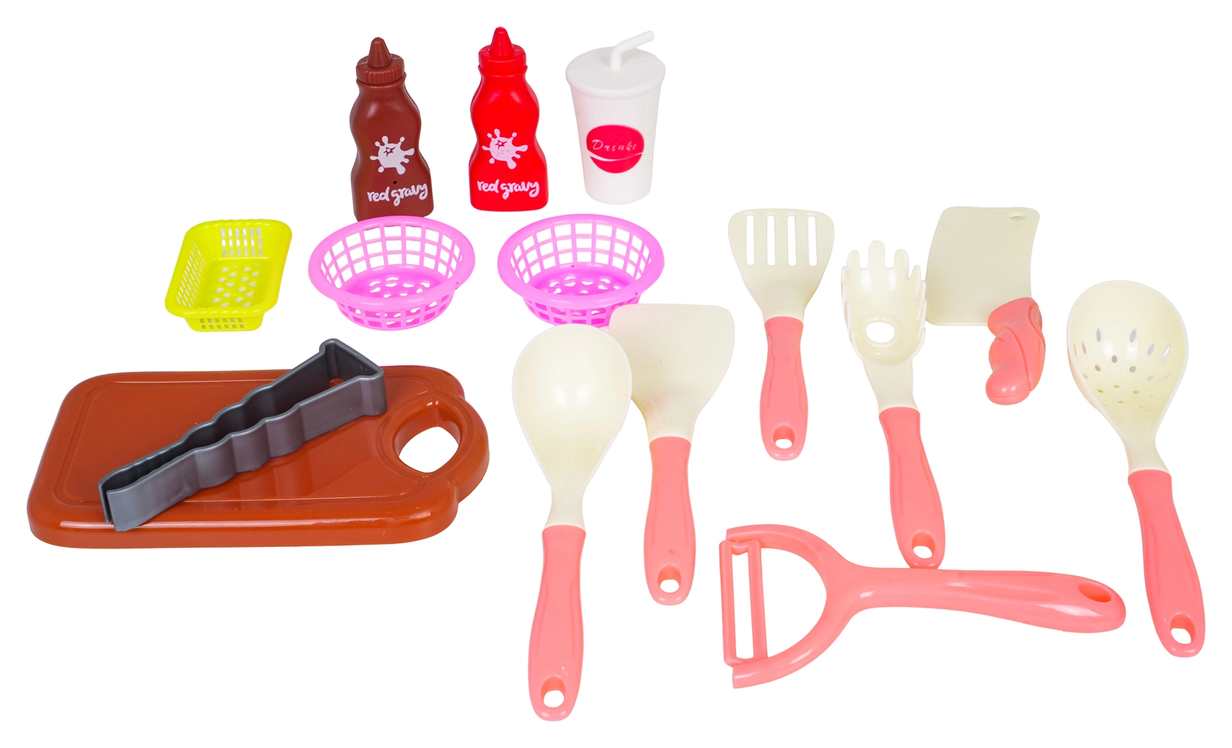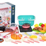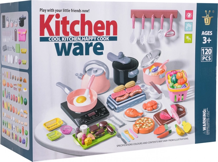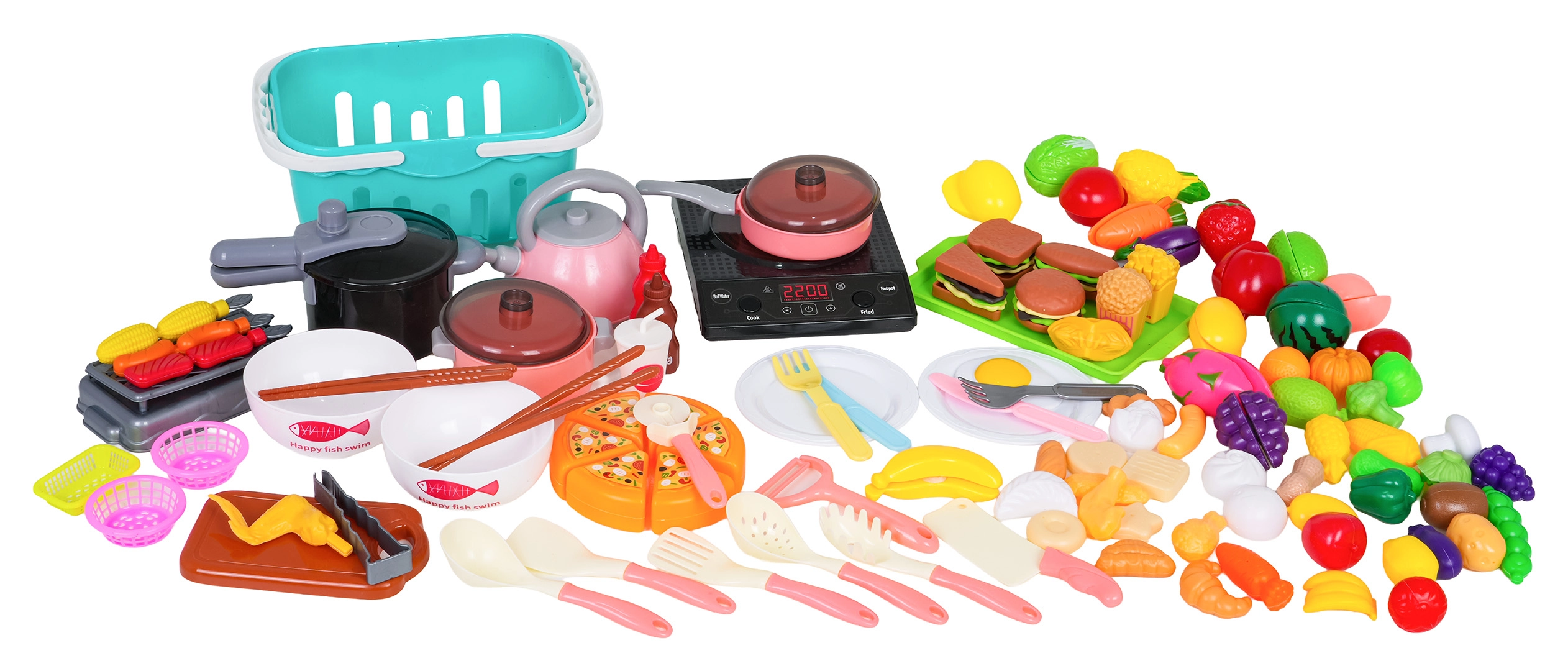 Súčasťou je indukčný varič na 3× AA (nie sú súčasťou), ktorý zobrazuje teplotu a má dotykové ovládanie; nechýba gril, sada riadu (rýchlovarná kanvica – hračka, tlakový hrniec, panvica, hrniec), servírovacie sady (misky, taniere, príbor, paličky), krájacie potraviny na suchý zips, pizza s krájačom, špízy a mnoho ďalšieho. Všetko je doplnené nákupným košíkom a servírovacím podnosom pre realistickú hru.