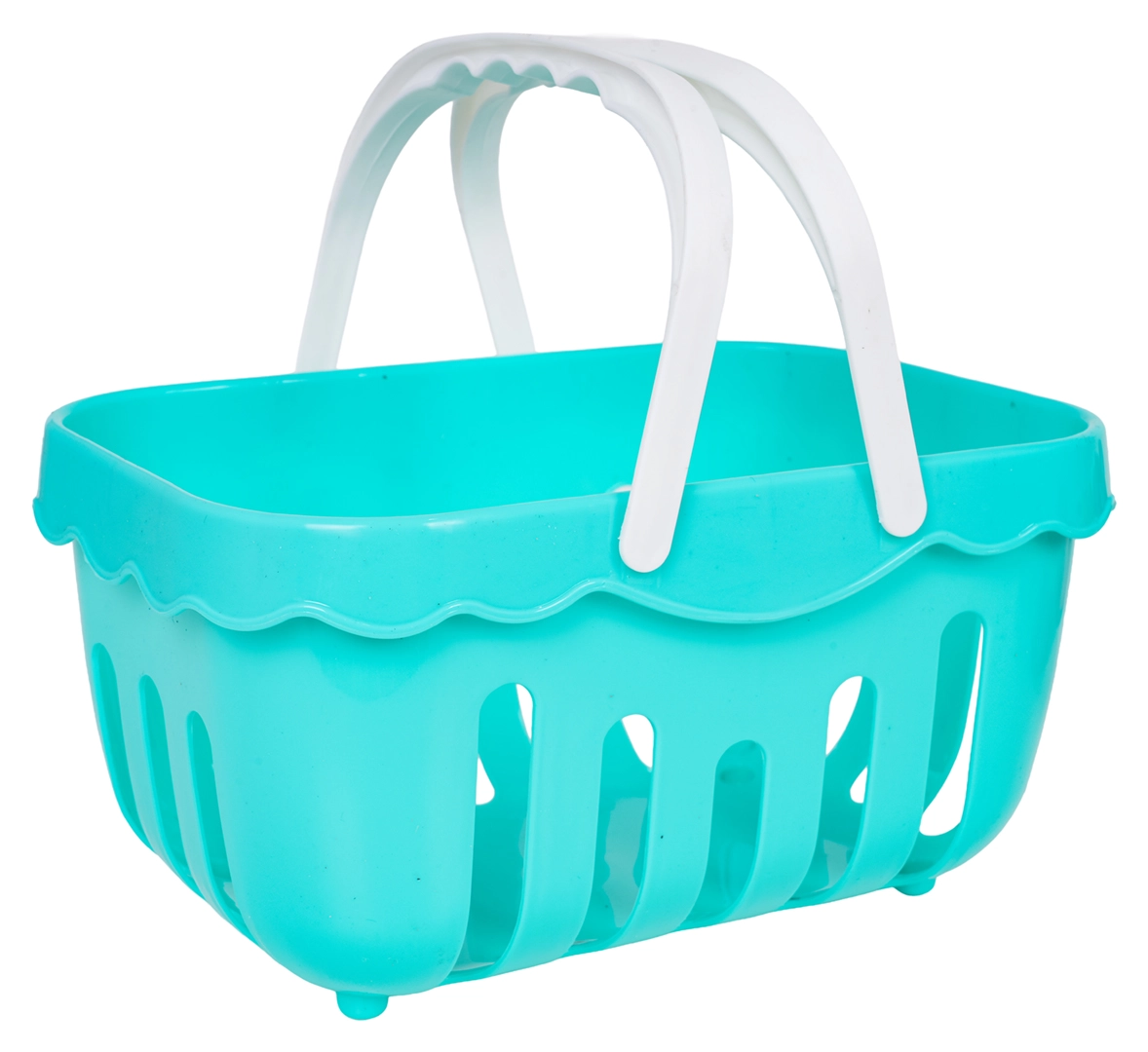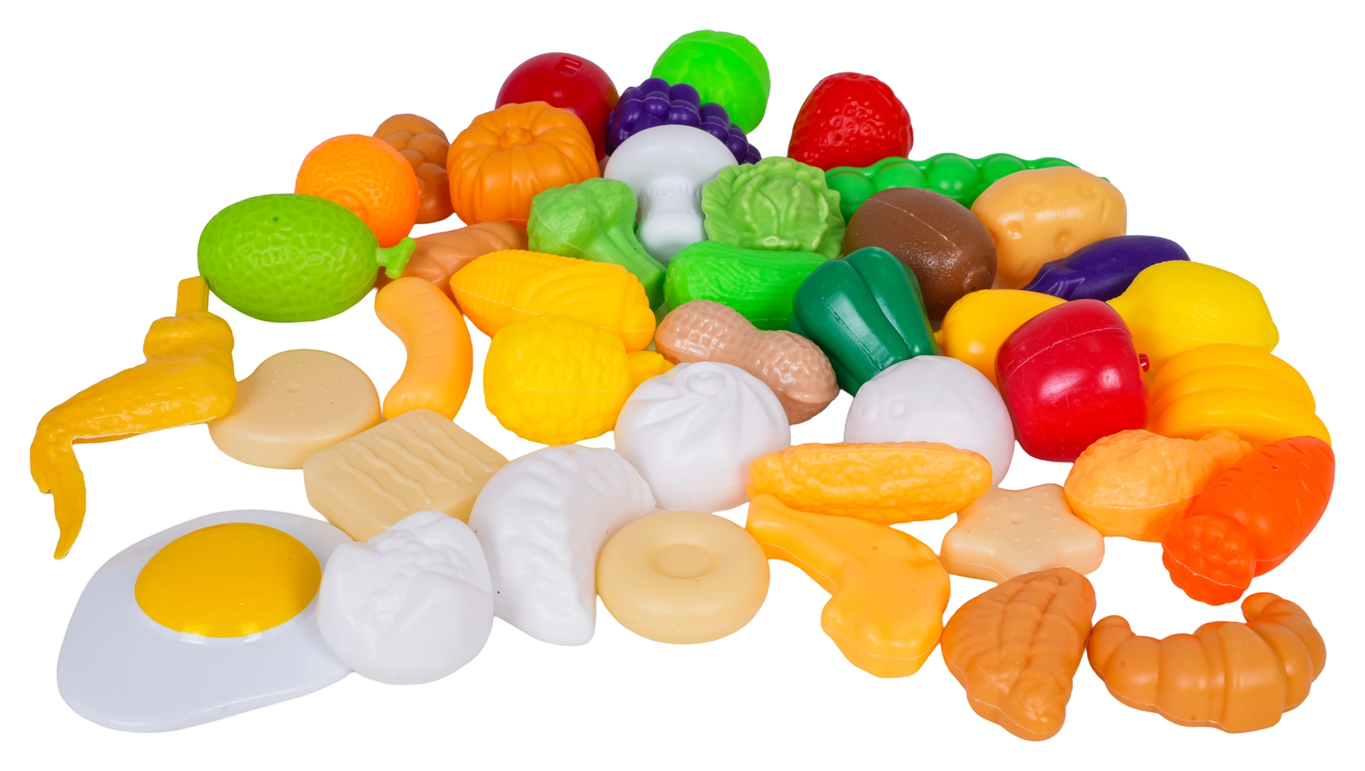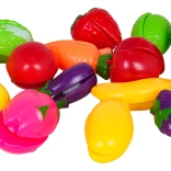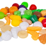 Veľký nákupný košík a pestrá sada ovocia a zeleniny vrátane kúskov na suchý zips učí rozpoznávať potraviny a trénuje jemnú motoriku pri krájaní.