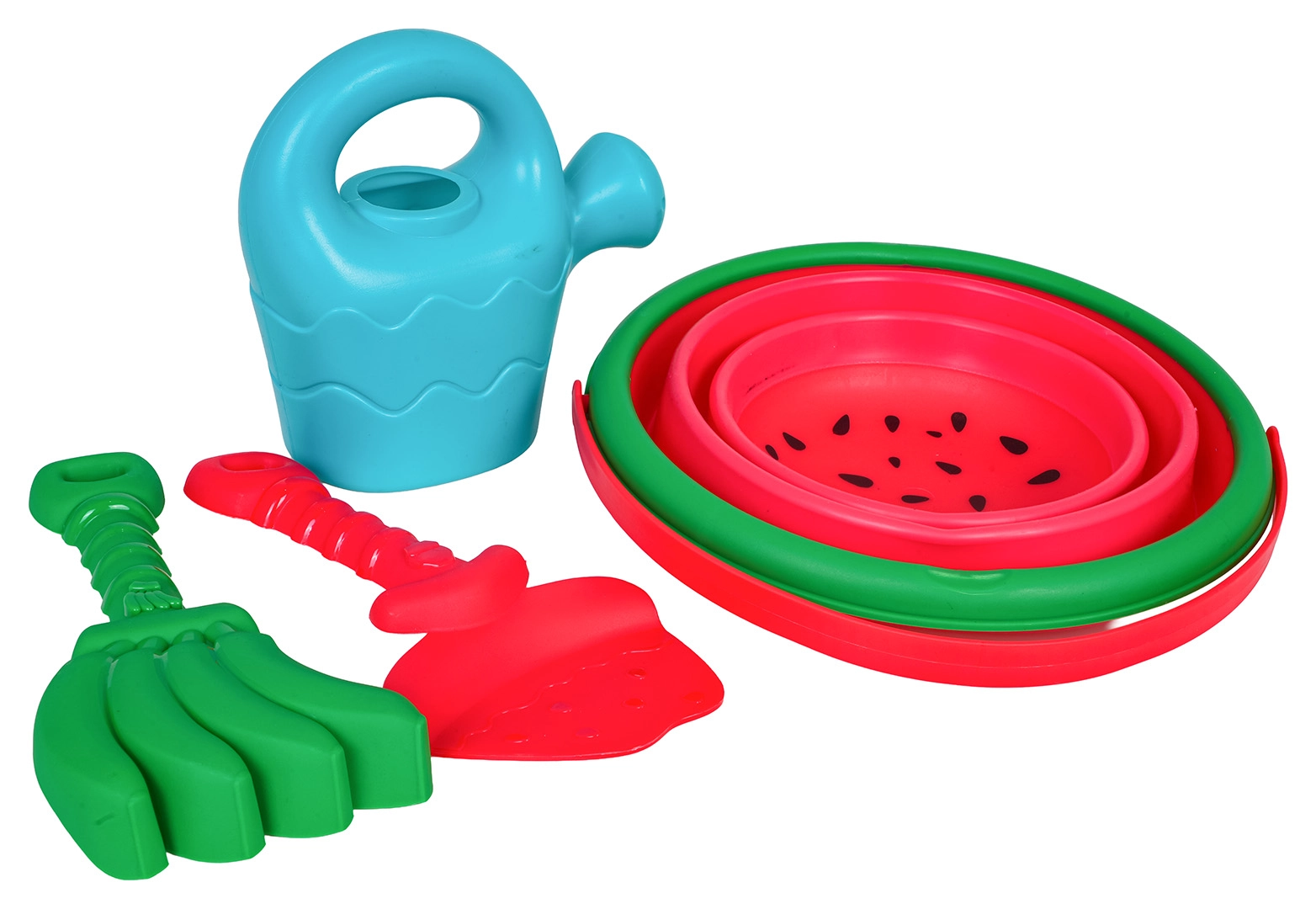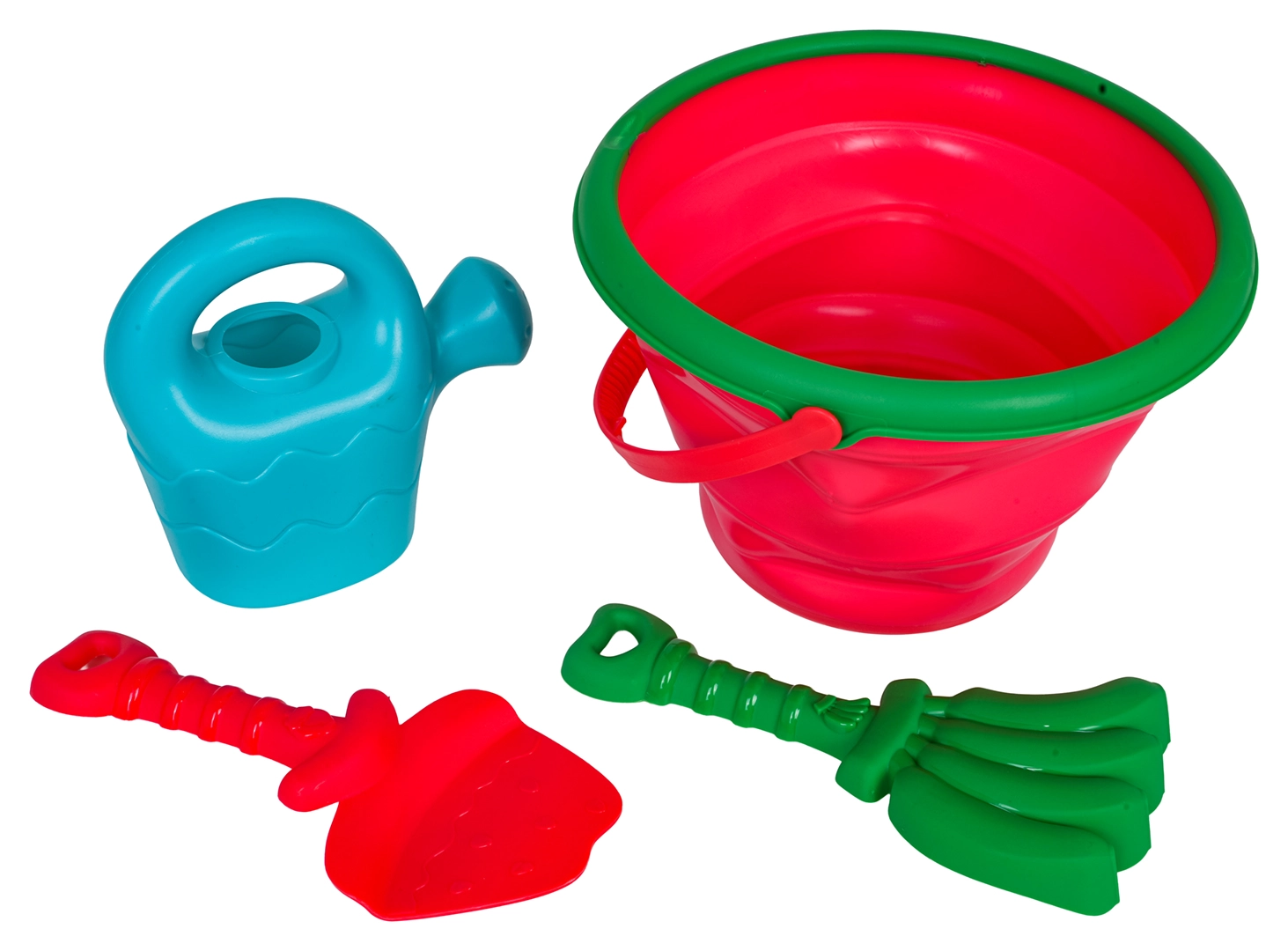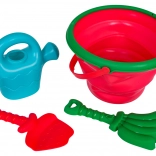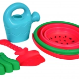 Lopatka, hrabličky a konva umožnia deťom kopať, hrabať, formovať aj prelievať vodu – všetko v jednom sete.