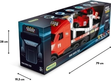 Veľký transportér Magic Truck Action Formula 1 poteší všetkých malých fanúšikov motorizmu a pretekov. Realisticky spracovaný ťahač s dlhým návesom prevezie dva priložené monoposty F1, ktoré môžete jednoducho naložiť pomocou rámp. Náves je odpojiteľný a možno ho pripojiť ku kabíne dvoma spôsobmi, čo rozširuje možnosti hry.