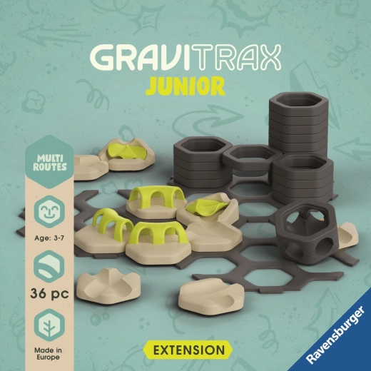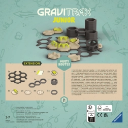 Rozšírenie prináša viac možností, ako viesť guľôčky rôznymi smermi a tvoriť záhadité cesty plné prekvapení. Je ideálne na rozšírenie existujúcich sád GraviTrax Junior a podporuje kreatívne a samostatné hranie detí od 3 rokov.