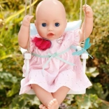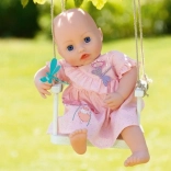Bábika s realistickými črtami a veľkými modrými očami prináša zábavu pri hre na hojdačke v prírodnom prostredí.