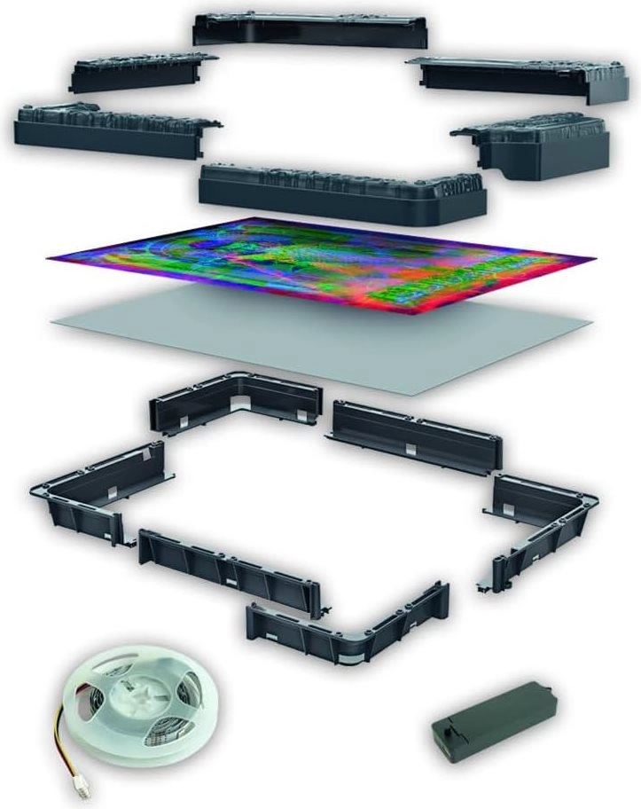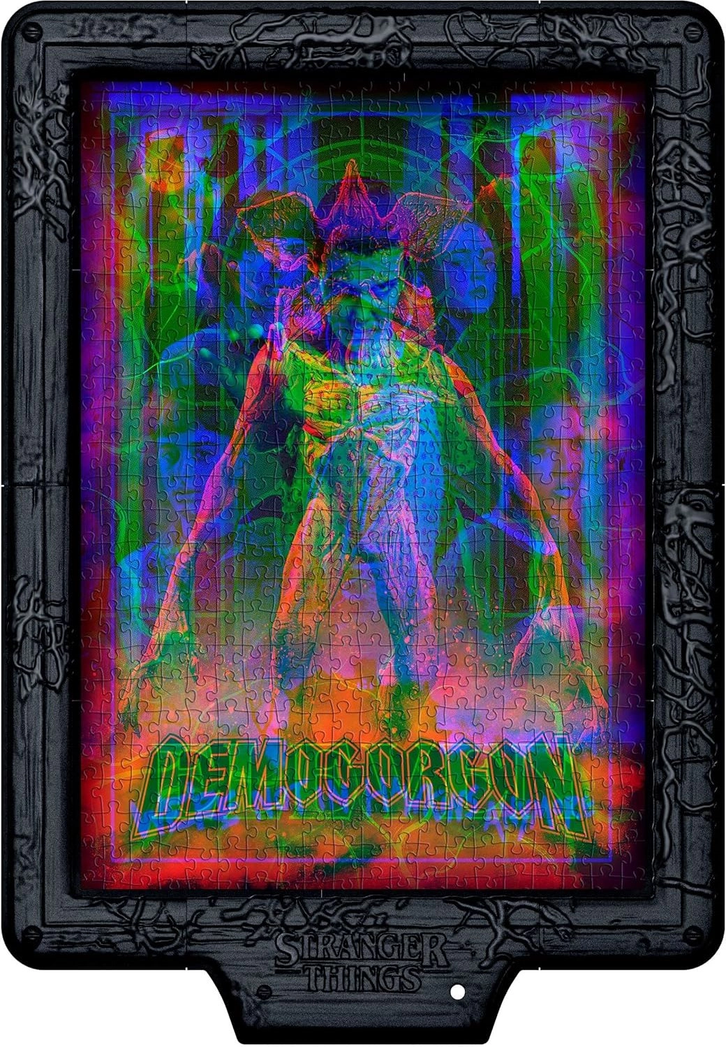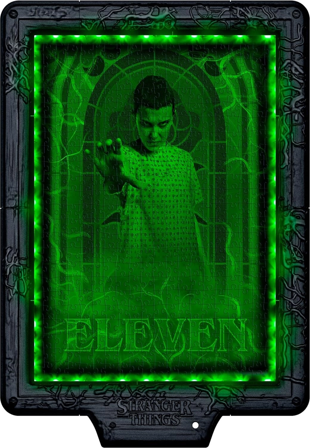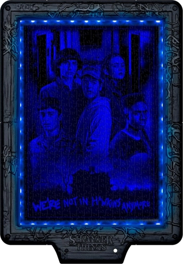 Toto jedinečné puzzle prináša filmovú atmosféru seriálu STRANGER THINGS do vášho domova. Vďaka integrovanému elektronickému modulu a RGB LED pásiku sa obraz po rozsvietení premení – každá farba LED odhalí inú vrstvu scény s lovom na Demogorgona. Pri bežnom osvetlení uvidíte kompozíciu s prekrytím troch farebných úrovní, v tme zas každý odtieň vykreslí nový detail.