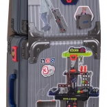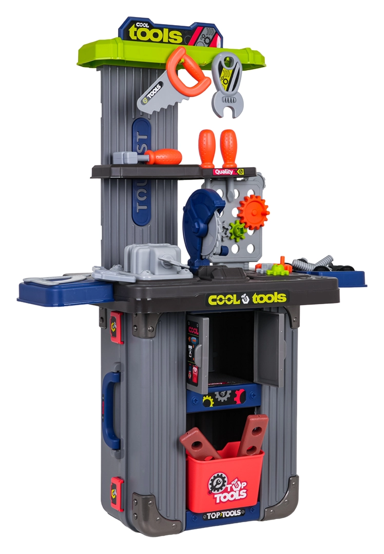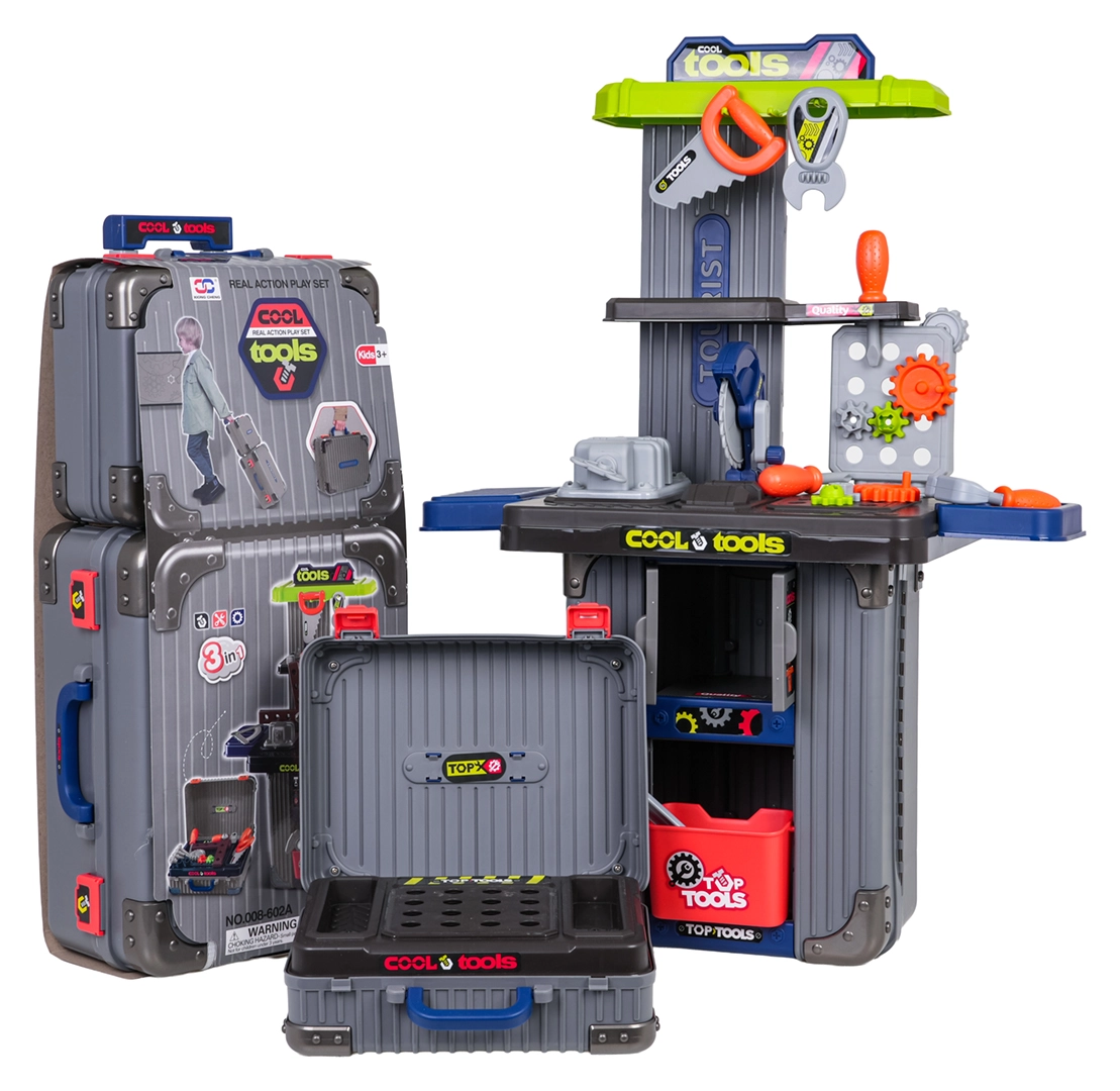 Prenosná detská dielenská sada 3v1, ktorá sa z kufríkov premení na stabilný pracovný ponk. Ponúka bohaté príslušenstvo, odolné plastové prevedenie a nekonečné možnosti kreatívnej hry pre deti od 3 rokov. V sade nájdete zverák, pílku, skrutky, skrutkovače, kľúče, ozubené kolieska a ďalšie doplnky – všetko prehľadne uložené v praktických kufroch na kolieskach.