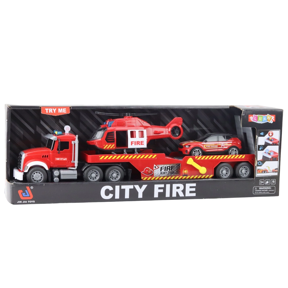 Veľký hasičský set City Fire nadchne každého malého záchranára. Obsahuje nákladné vozidlo s odťahovou plošinou, hasičské auto a záchranársky vrtuľník. Odolné plastové prevedenie, realistický vzhľad v červenej hasičskej farbe a svetelné aj zvukové efekty sa postarajú o hodiny zábavy.