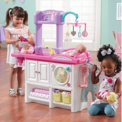 Integrovaný prebaľovací pult a postieľka s otáčajúcim sa kolotočom, doplnené umývadlom s otočným kohútikom, robia zo starostlivosti o bábiku prirodzenú a zábavnú súčasť hry.