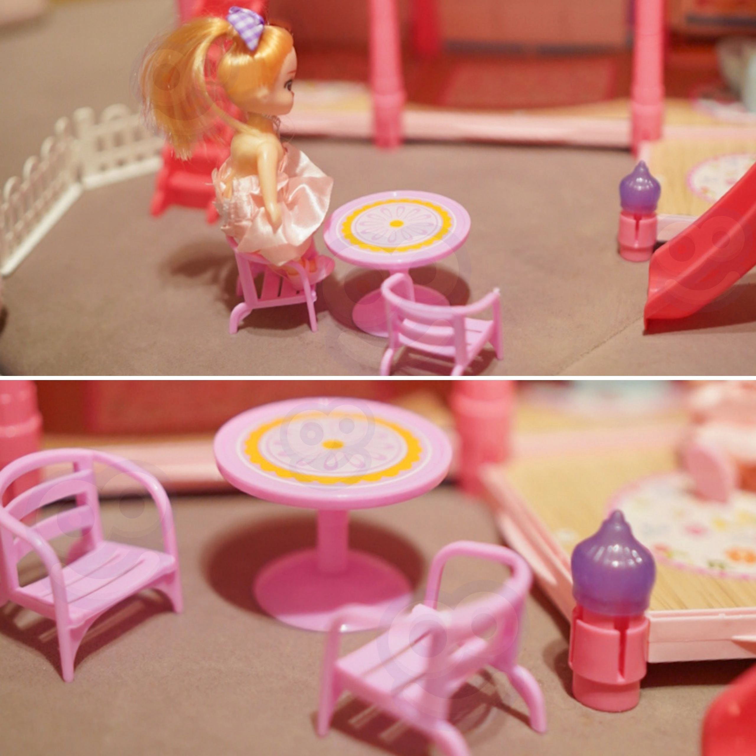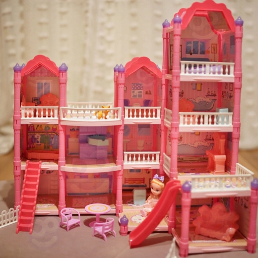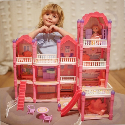 Objavte čarovný trojposchodový domček pre bábiky s ružovou strechou, bohatým vybavením a nočným osvetlením. Sada ponúka 296 dielov vrátane roztomilého nábytku, doplnkov a bábiky, takže si deti môžu samy zariadiť každú izbu. Šmýkačka, schody a terasa pridávajú ďalšiu zábavu a podporujú kreativitu, predstavivosť aj jemnú motoriku.
