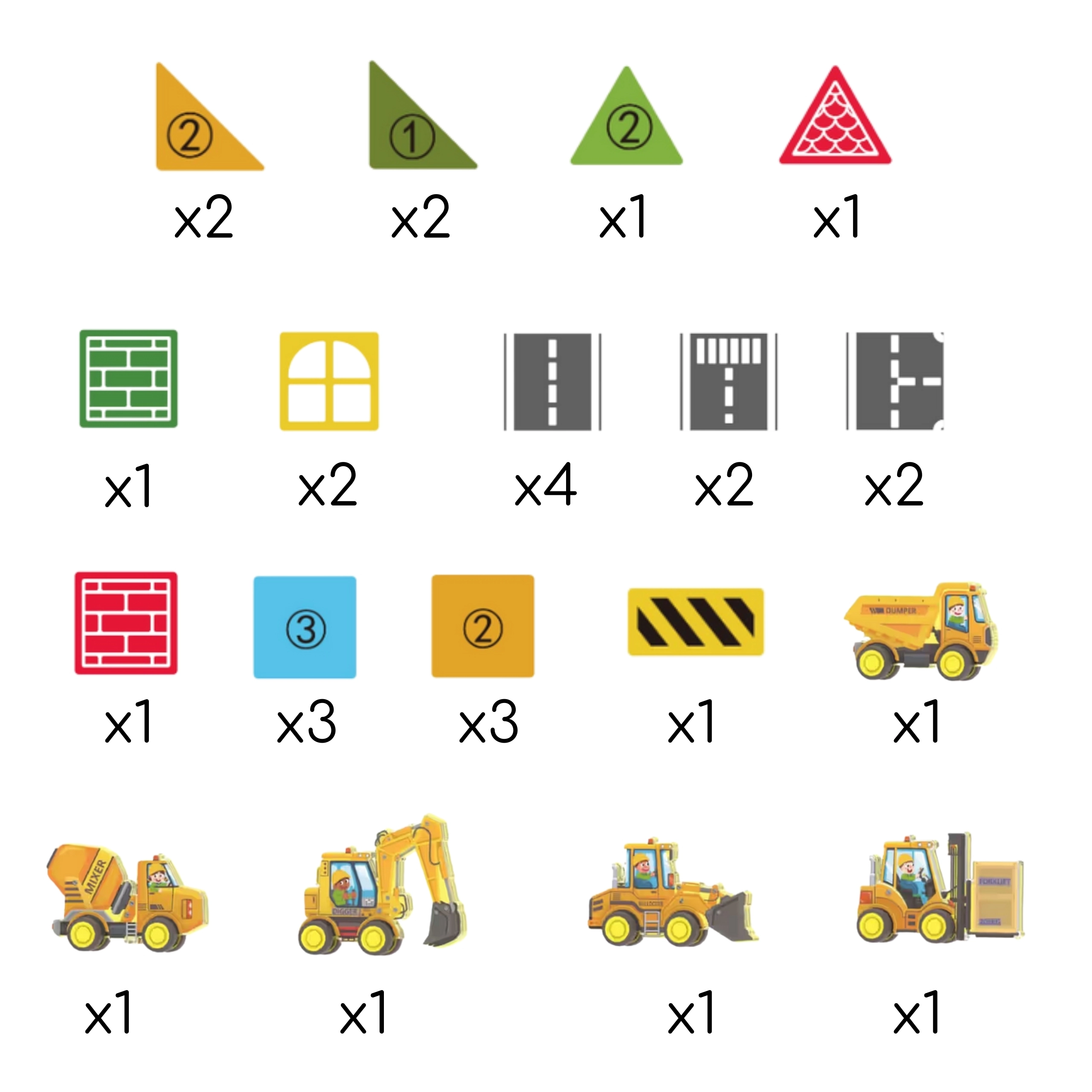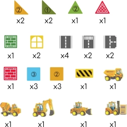 - 12 × štvorec, 2 × trojuholník, 4 × trojuholník (rôzne typy), 4 × cesta, 2 × okno, 1 × brána