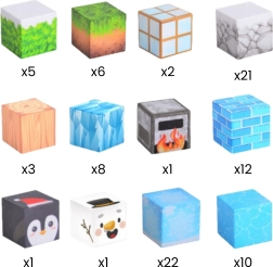 - 6× kocka (vzor ľadu); 14× kocka (vzor kameňa); 3× kocka (vzor dreva); 16× kocka (vzor listov); 18× kocka (vzor modrého ľadu); 3× kocka (vzor tučniaka); 1× kocka (vzor ľadového medveďa); 13× kocka (vzor kameňa pod snehom); 1× kocka (vzor kamienok/pec); 1× kocka (bez špecifikovaného vzoru)