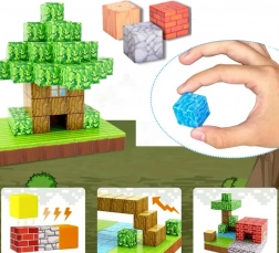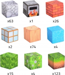 - 14× kocka (kameň), 19× kocka (tráva), 15× kocka (lístie), 15× kocka (tehla), 15× kocka (voda), 14× kocka (drevo), 14× kocka (zem), 1× kocka (pec), 1× kocka (špeciálny vzor)