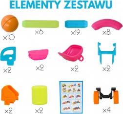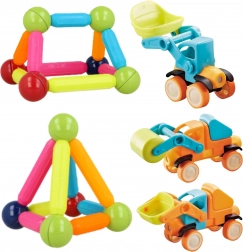 10 magnetických guliek, 12 krátkych magnetických tyčiek, 8 zahnutých magnetických tyčiek, 16 dielov na stavbu vozidiel