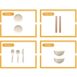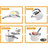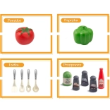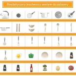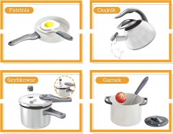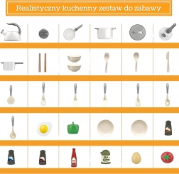 - Hrnce s pokrievkami a úchytmi, panvica s volským okom, čajník, taniere, misky, príbory (vidličky, lyžice, paličky, obracačky), soľnička, korenička, zelenina (paradajka, paprika), fľaštičky s omáčkami/korením