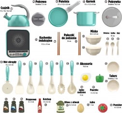 • Bohaté príslušenstvo: hrnce s pokrievkami, panvica s vajíčkom, kanvica, tanieriky a misky, príbory, zelenina, korenie.
