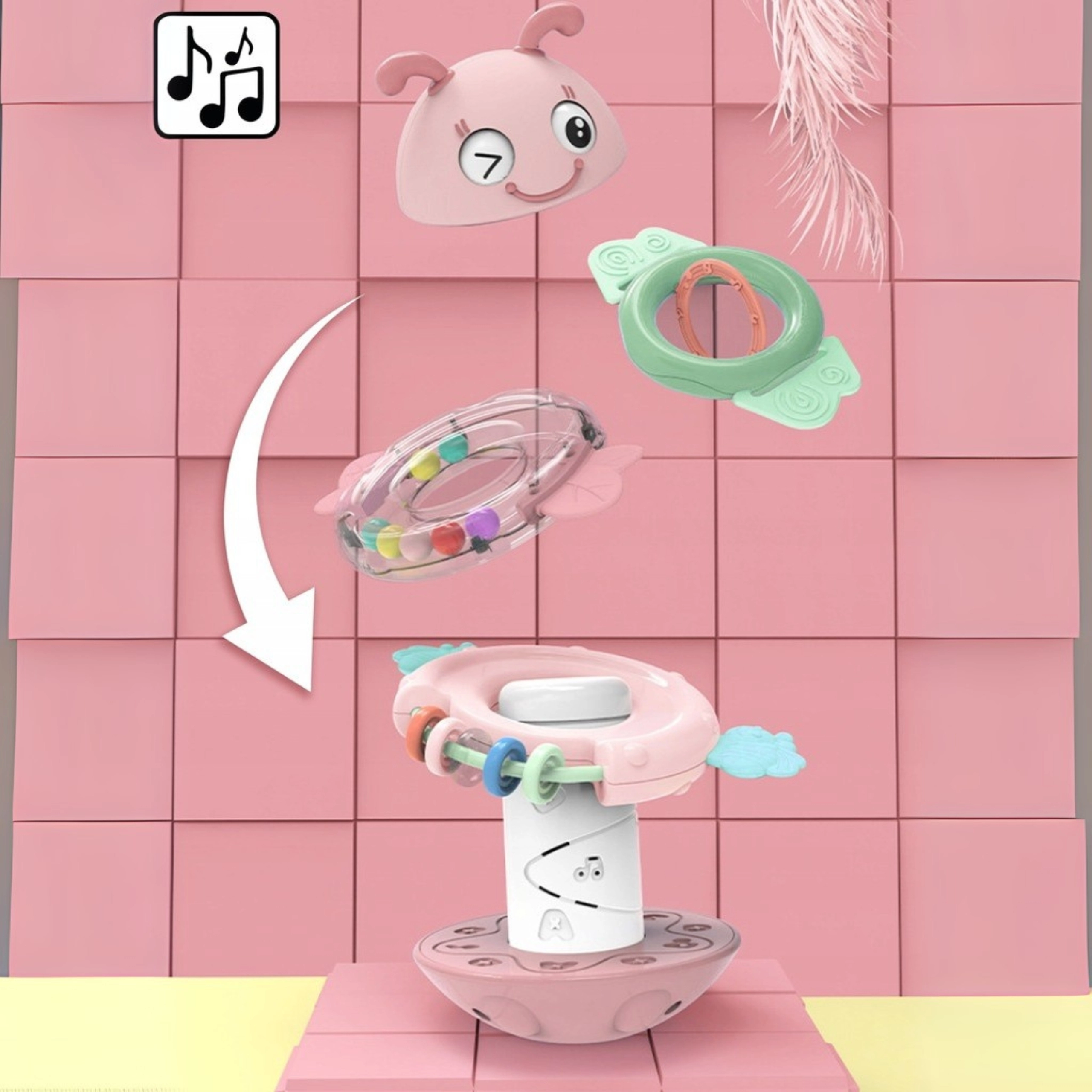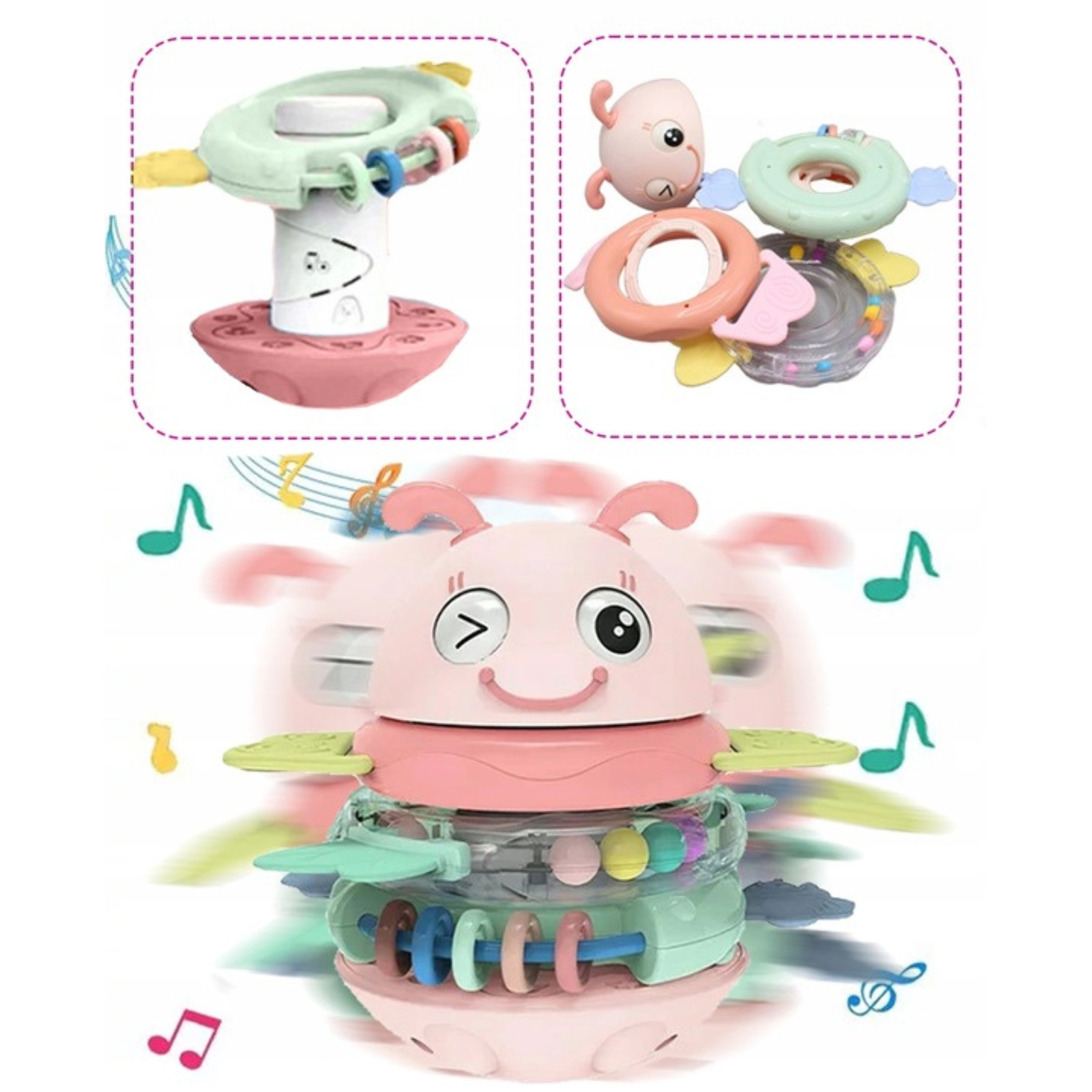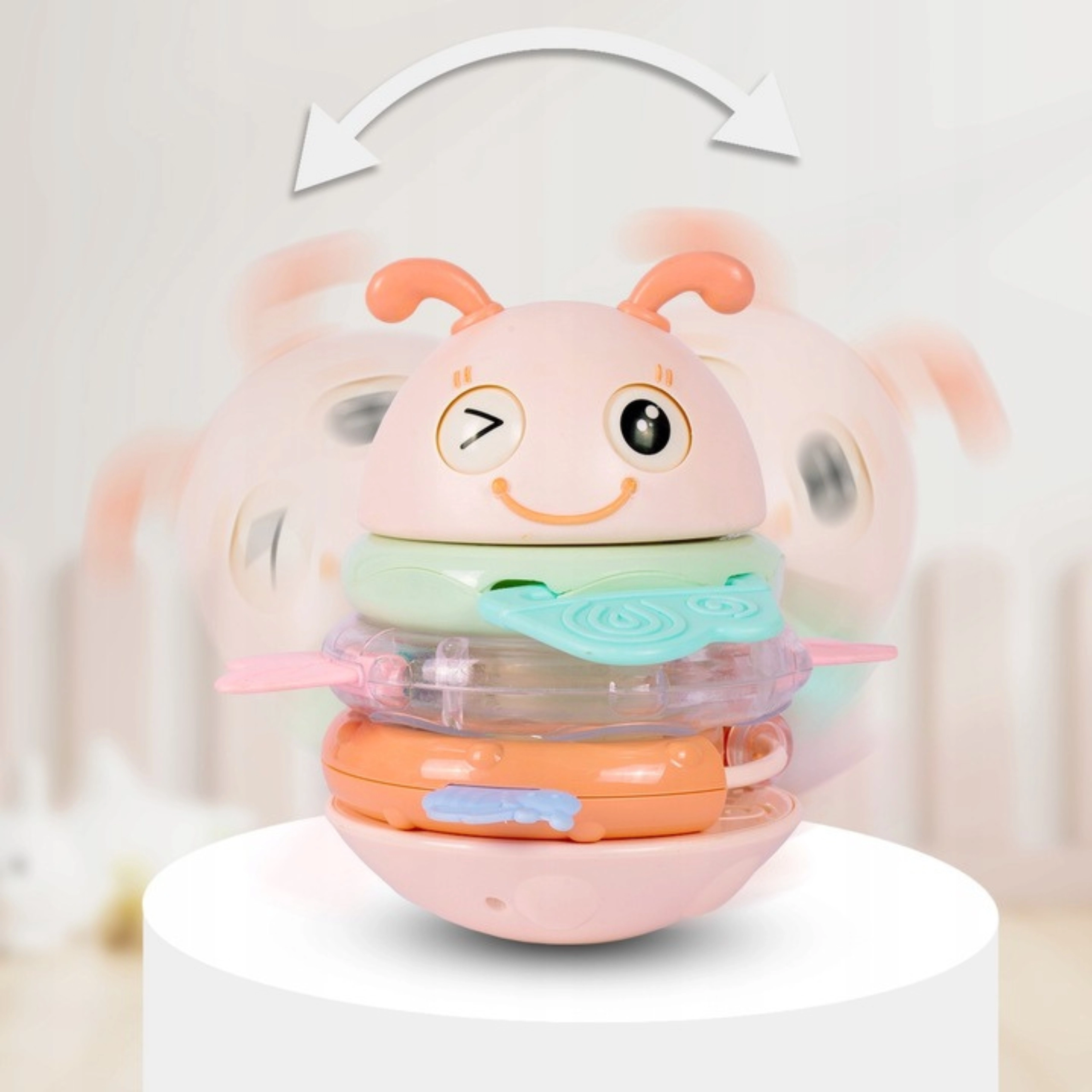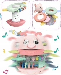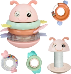 Hľadáte hračku pre bábätko, ktorá zaujme, upokojí ďasná a zároveň podporí vývoj? Táto ružová včielka WOOPIE je multifunkčná senzorická hračka vhodná od prvých mesiacov. Krúžky možno používať samostatne ako hryzátka a hrkálky, alebo ich nasadiť na kolík – hračka potom prehrá pesničku či vydá vtipný zvuk. Stabilná, zaoblená základňa sa jemne hojdá a motivuje dieťa k opakovanému skúmaniu.