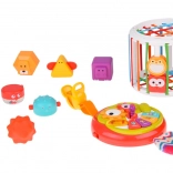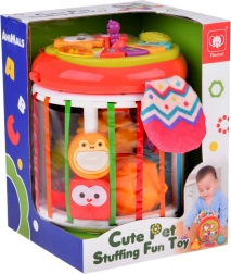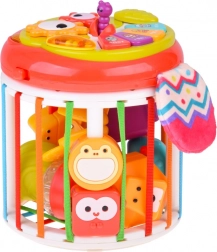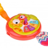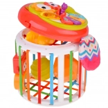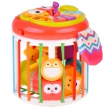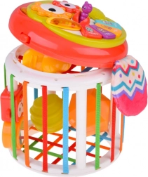 Interaktívna sova 2v1 ponúka dve hry v jednom: elektronickú časť s tlačidlami zvieratiek a tónmi a samostatný farebný sorter. Po zapnutí prehrá uvítaciu melódiu, jednotlivé tlačidlá aktivujú názvy tónov, zvuky zvieratiek, krátke inštrumentálne melódie a veselé pesničky. Deti si užijú otočné oči, pohyblivé krídelká s guličkami, mäkký šuštiaci chvostík aj ťahacieho „červíka“ na gumičke.