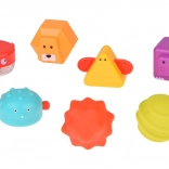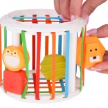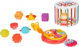 Sorter tvoria pružné farebné pásiky, ktoré umožňujú ľahké vkladanie a vyťahovanie dielikov a prirodzene tak rozvíjajú úchop, silu a presnosť prstov. Nechýba malé bezpečné zrkadielko na objavovanie vlastného odrazu a sada 7 rôznofarebných prvkov na vkladanie. Celok stimuluje sluch, zrak i hmat, podporuje sústredenie a samostatné objavovanie.
