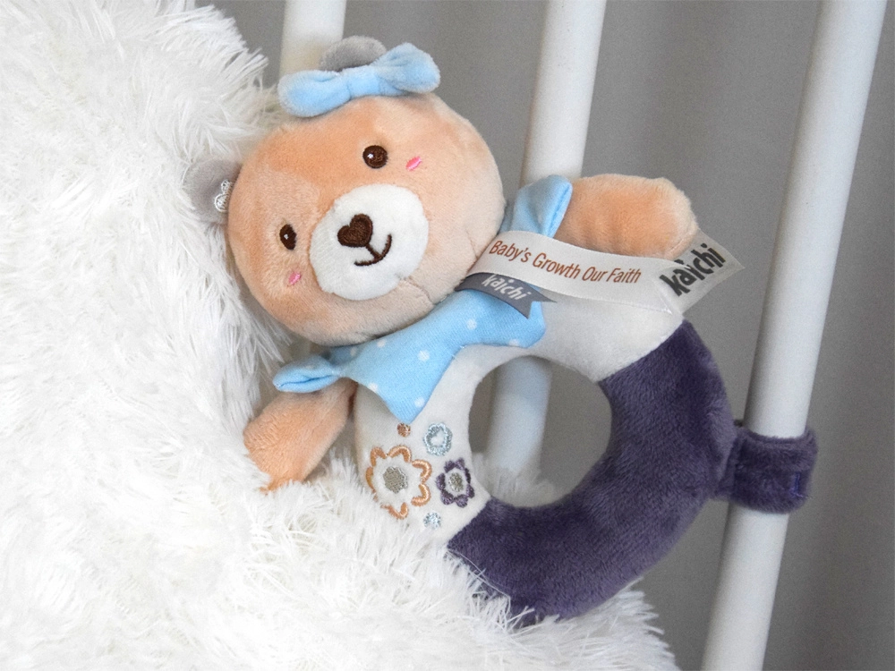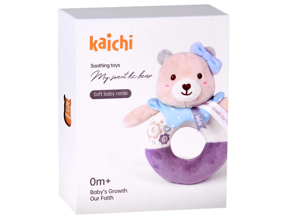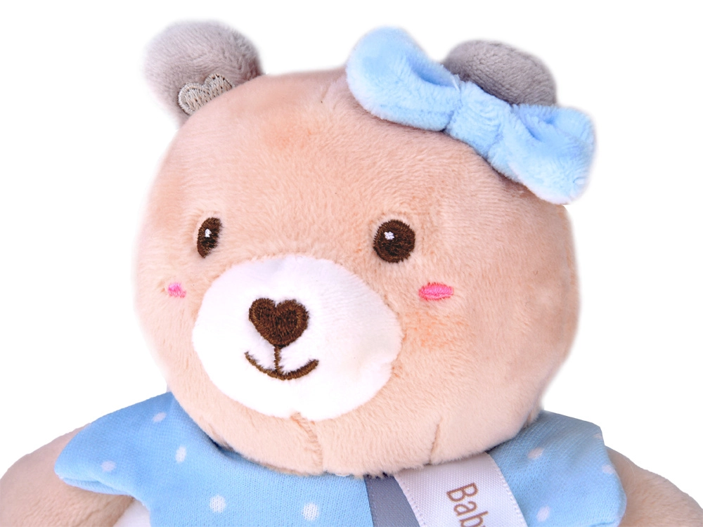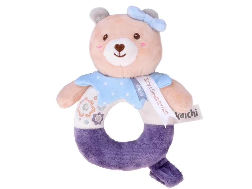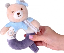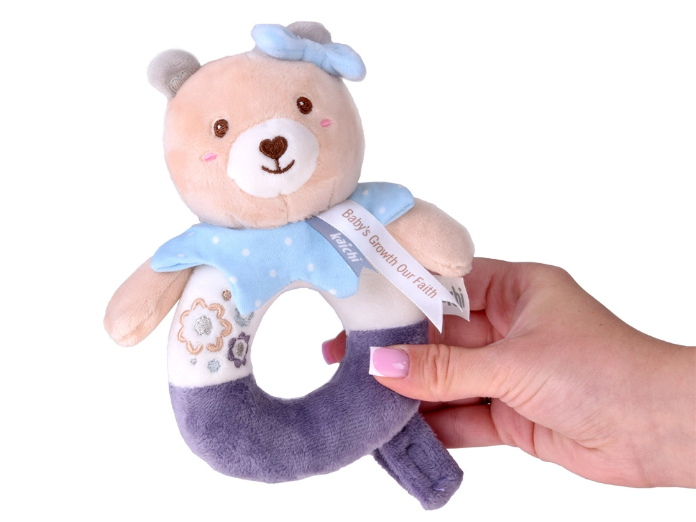 Plyšová hrkálka medvedík bola ušitá z kvalitných a veľmi mäkkých materiálov príjemných na dotyk. Tvar krúžku uľahčuje ľahké uchopenie a držanie, takže je ideálna pre prvé pokusy bábätka trénovať úchop. Jemné, vyšívané detaily (očká, ňufáčik, ozdoby) zabezpečujú maximálnu bezpečnosť bez drobných častí.