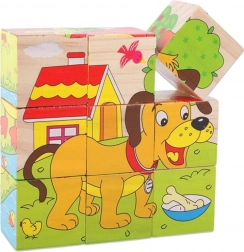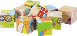 Drevená skladačka s kockami rozvíja logické myslenie, trpezlivosť a jemnú motoriku formou hry. Z 9 kociek poskladáte 6 rôznych obrázkov z farmy so zvieratami. Ľahké, hladké a bezpečné drevené kocky s farebnými ilustráciami skvele sadnú do malých rúčok a podporujú vnímanie tvarov a farieb.