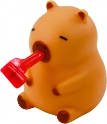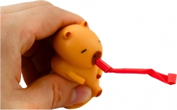 Hnedá kapybara s červenou trúbkou je vyrobená z príjemne mäkkého a elastického materiálu, ktorý sa skvele stláča a podporuje relaxáciu. Pri stlačení sa aktivuje pískací zvuk a z papuľky sa vysunie trúbka, čo z hračky robí skvelý antistresový doplnok aj originálnu zábavu pre skupinu.