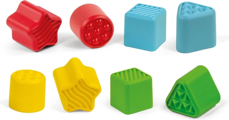 Každá kocka má výrazný povrch na stimuláciu dotyku. Mäkký, bezpečný materiál podporuje zmyslové vnímanie a je vhodný aj na hmatovú hru.