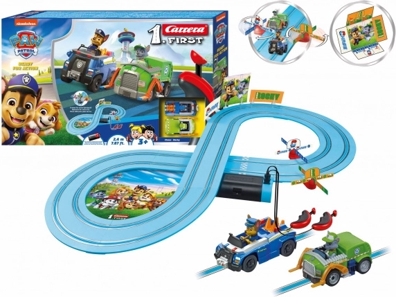 Zábavná autodráha CARRERA FIRST s motívom Tlapková patrola prináša deťom od 3 rokov prvé pretekárske zážitky. Súčasťou sú autá Chase a Rocky, jednoduché ovládače, točiace sa vrtule pre väčšie napätie a dráha dlhá 2,4 m. Napájanie na batérie zabezpečuje jednoduché použitie kdekoľvek a jednoduchá montáž so systémom svoriek poteší rodičov.