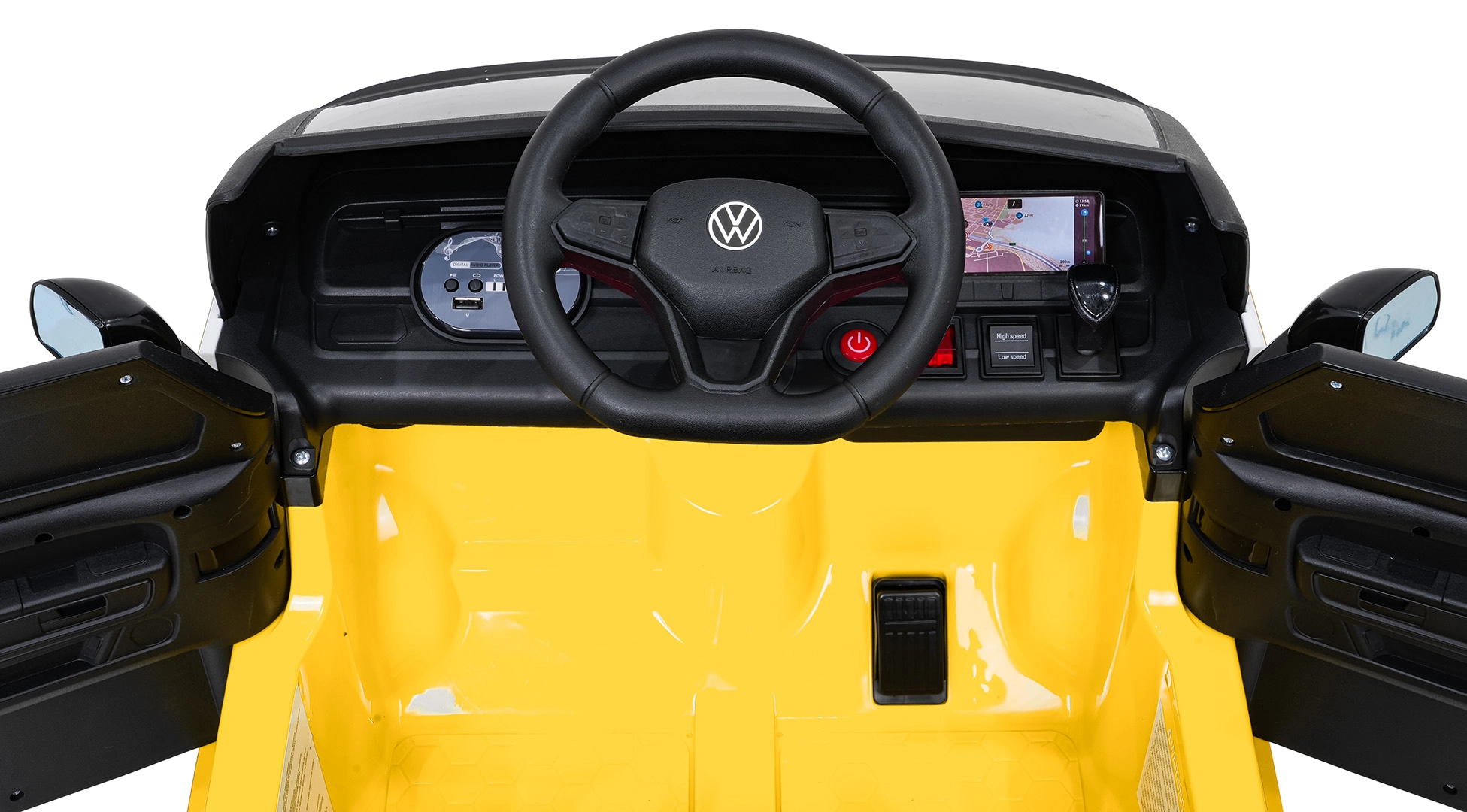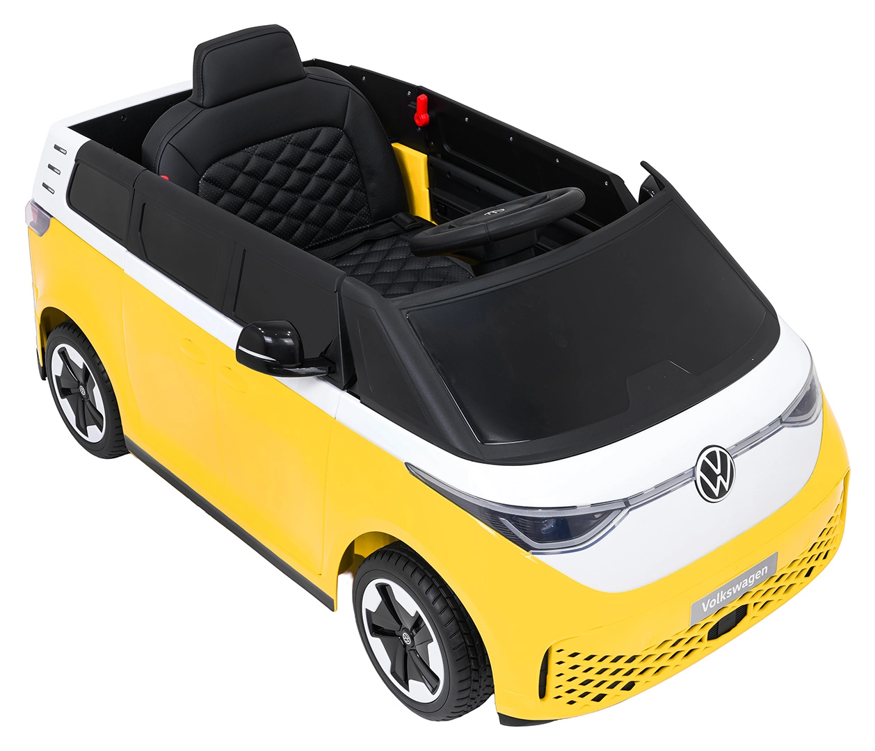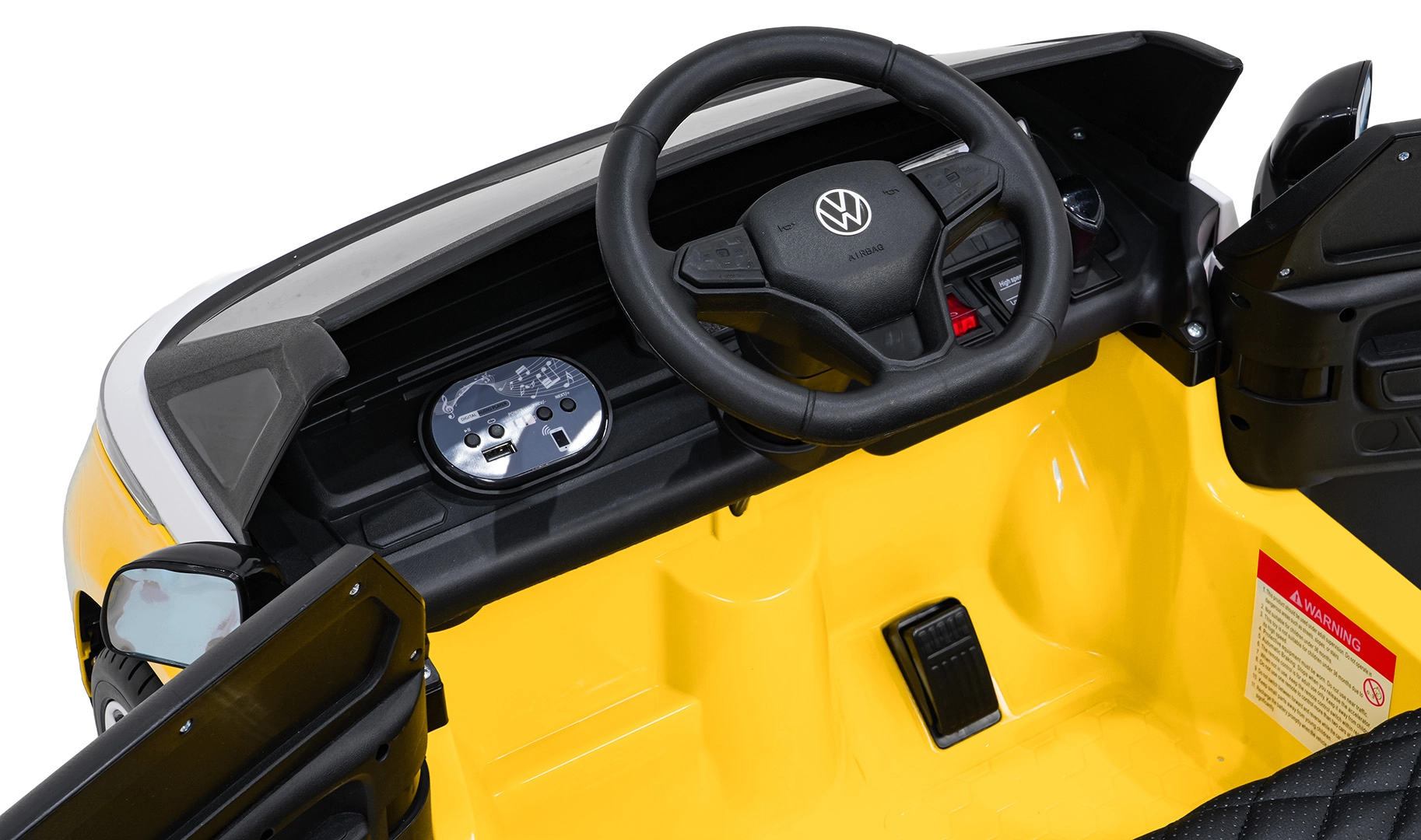 Bezpečie a pohodlie sú na prvom mieste: zmäkčené sedadlo z eko kože s bezpečnostným pásom, diaľkový ovládač 2,4 GHz s 3 rýchlosťami a tlačidlom núdzového zastavenia pre kontrolu dospelých. LED predné svetlá a spínač svetiel podčiarkujú realistický vzhľad, otváracie dvere uľahčujú nastupovanie a zadný úložný priestor pojme drobnosti na cesty.