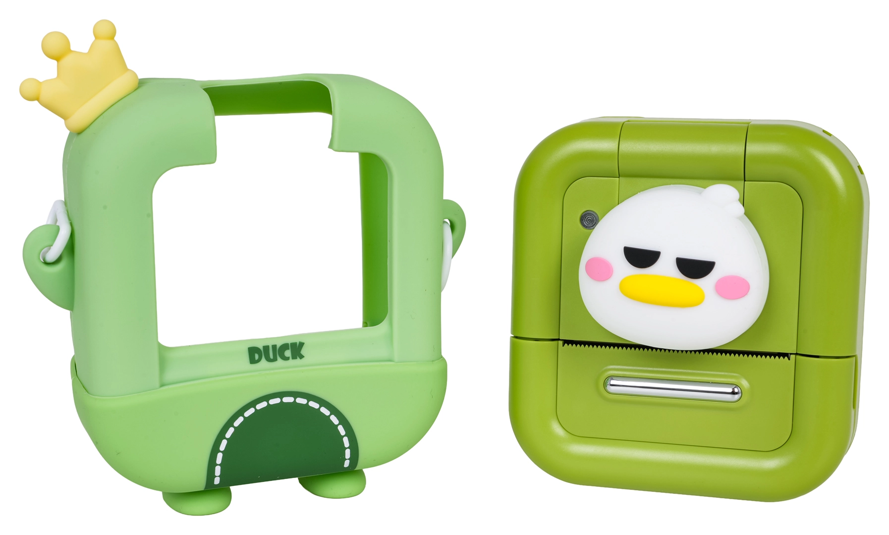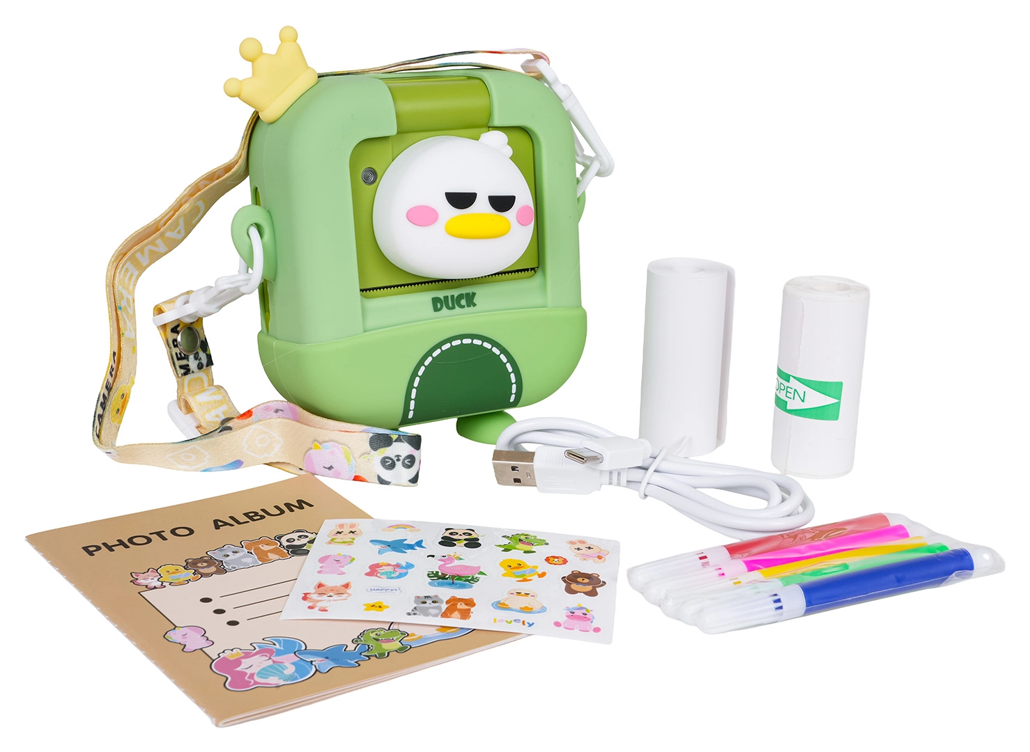 Detský instantný fotoaparát s motívom kačičky kombinuje jednoduché ovládanie, okamžitú čiernobielu tlač a kreatívnu tvorbu. Kompaktné telo s popruhom je skvelé na cesty a ochranné puzdro zaistí bezpečné prenášanie. V balení nájdete všetko, čo deti potrebujú na vlastnú fotoknižku – od termopapiera cez fixky až po album a nálepky.