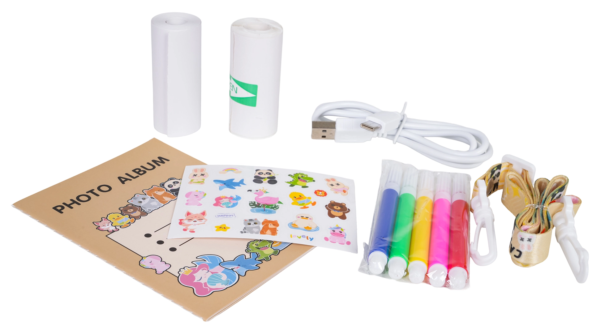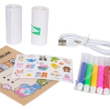 Fotoalbum, 2 role papiera, USB kábel, šnúrka, nálepky a 5 farebných fixiek – kompletná výbava na tvorbu vlastných spomienok.