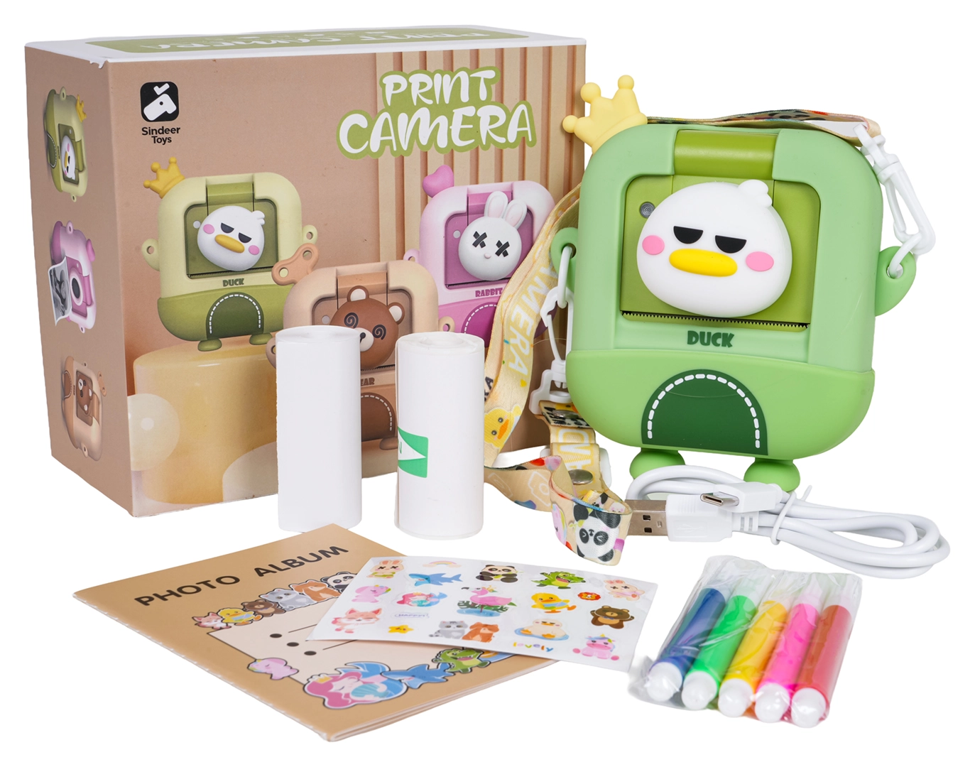 - Fotoaparát s motívom kačičky, ochranné puzdro, 2× rola termopapiera, šnúrka, USB kábel, fotoalbum, 5 fixiek, nálepky, dekoratívne samolepky, návod