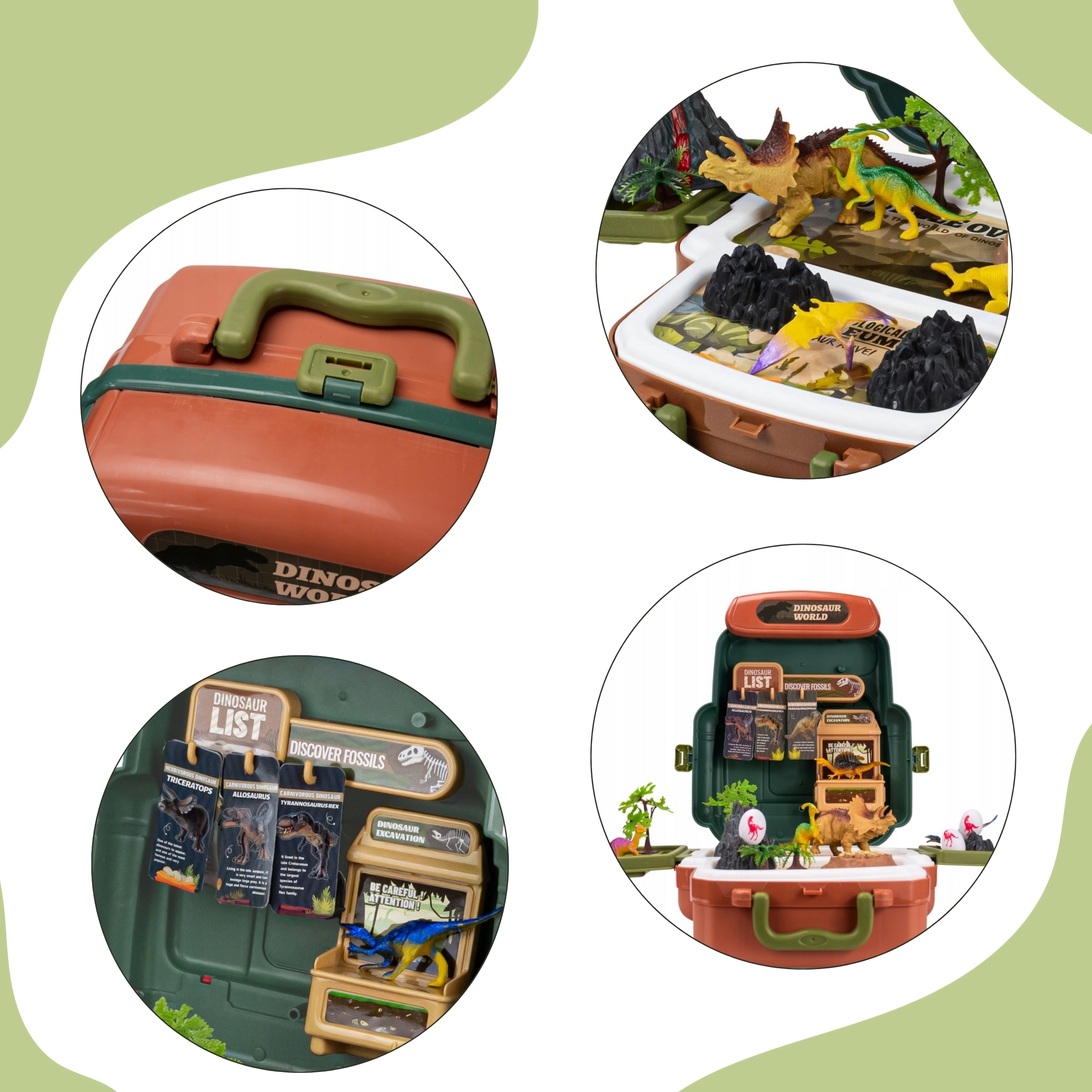Kufrík Dinosaur World prenesie deti do fascinujúcej doby dinosaurov. Po otvorení vznikne herná scéna s terénom, stromčekmi a doplnkami, kde si deti môžu vytvárať vlastné príbehy. Sada zahŕňa farebné figúrky rôznych druhov dinosaurov, vajíčka, vulkán a doplnky na tému objavovania fosílií.