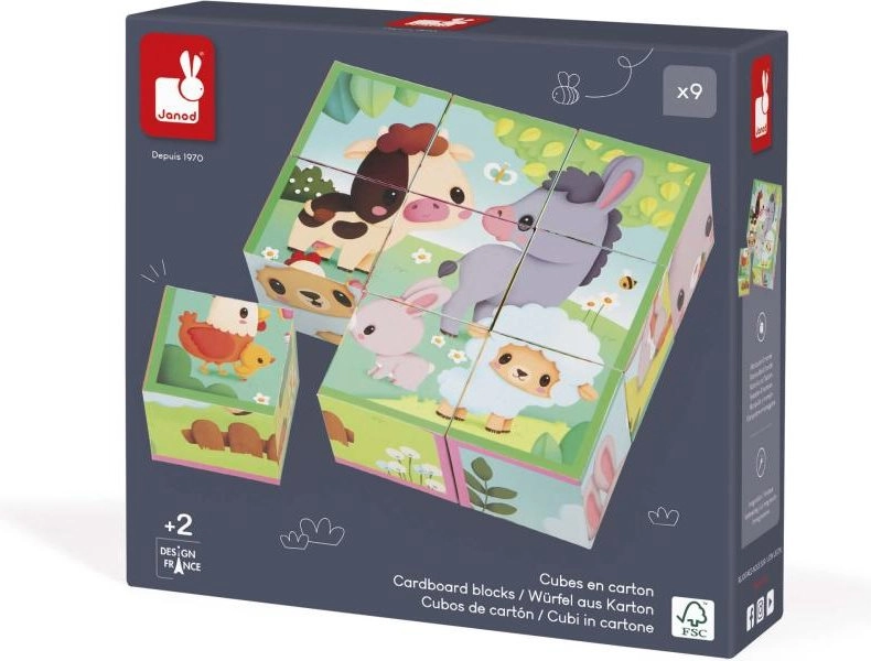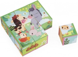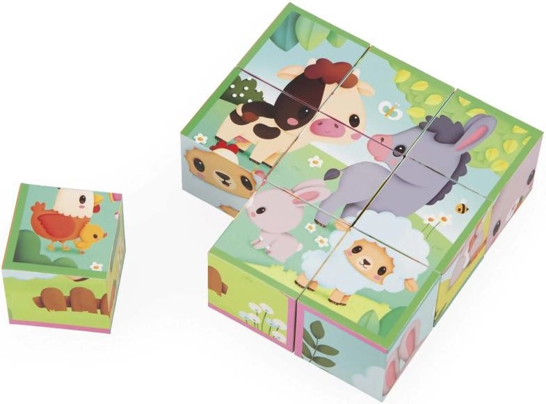Táto klasická sada obrázkových kociek s motívmi farmy prináša deťom radosť z objavovania a učenia. Z 9 kvalitných drevených kociek ľahko zložíte 6 rôznych obrázkov so zvieratkami. Deti si precvičia skladanie, triedenie a orientáciu v priestore, zatiaľ čo sa hrajú.