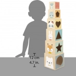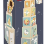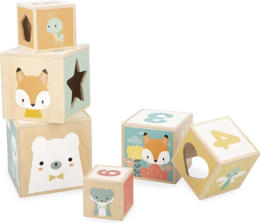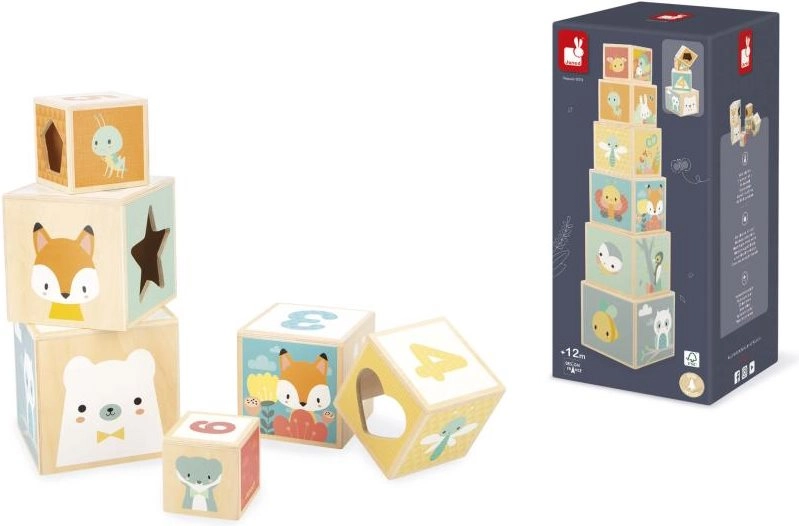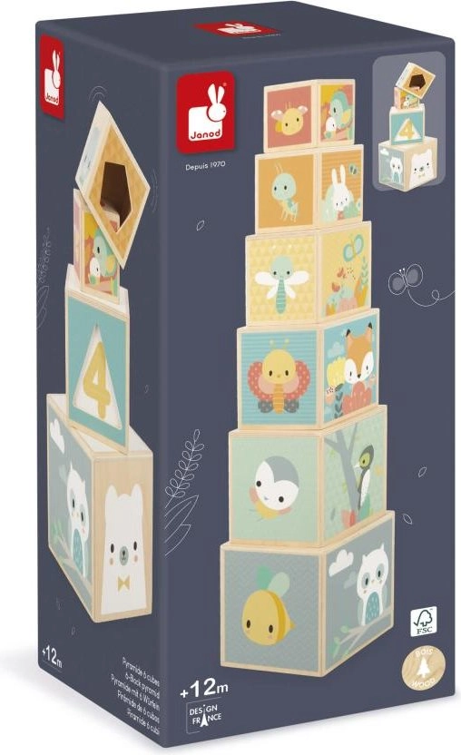 Táto drevená pyramída zo 6 kociek poteší jemnými farbami a láskavými ilustráciami. Deti môžu kocky ukladať, triediť a kombinovať, čím lepšie chápu princípy rovnováhy, veľkostí a priestoru. Každá kocka má 5 rôznych strán: roztomilé zvieratko, zvieratko v prostredí, malé zviera na farebnom pozadí, číslice na prvé počítanie a vystrihnutý tvar, ktorý po spojení dvoch kociek odhalí veselý obrázok (napríklad mačičku v srdci).