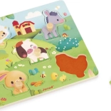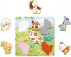 Táto kvalitná drevená vkladačka prináša deťom nielen radosť z hry, ale aj zmyslové objavovanie. Pod piatimi dielikmi sa skrývajú hmatové textúry napodobňujúce srsť alebo kožu zobrazených zvieratiek, ktoré podporujú senzorický rozvoj a prirodzenú zvedavosť.