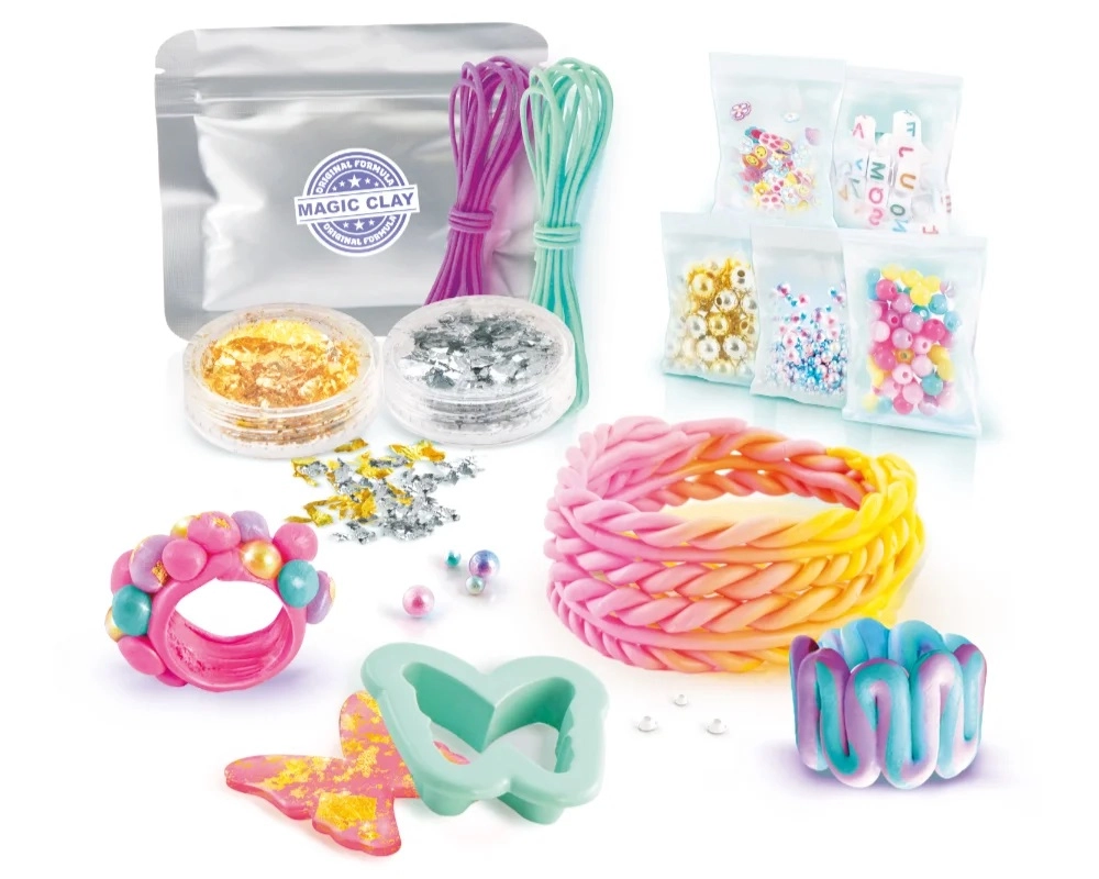 - 4 vrecúška modelovacej hmoty v rôznych farbách; 5 vrecúšok s korálkami a ozdobami; 1 arch so vzormi na odtlačok; 2 fľaštičky s dekoratívnou fóliou; 2 šnúrky; 2 formy; návod a inšpiračná karta