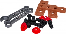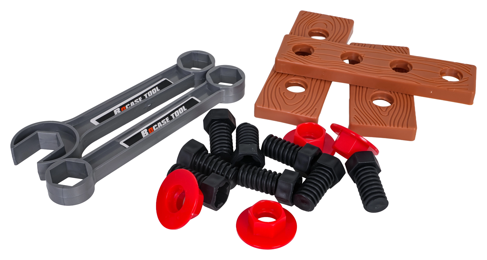 V balení nájdete všetko potrebné: kladivo, kliešte, hasák, nastaviteľný kľúč, skrutkovač s výmennými bitmi, skrutky, matice aj „drevené“ lišty s otvormi na precvičovanie. Diely sú navrhnuté pre malé detské ruky s dôrazom na pohodlné držanie a bezpečné používanie.