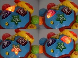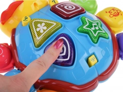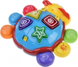 Stlačením farebných tlačidiel sa deti zoznamujú s farbami a zvieratkami; kvízové tlačidlo s otáznikom vyzýva k jednoduchým úlohám.