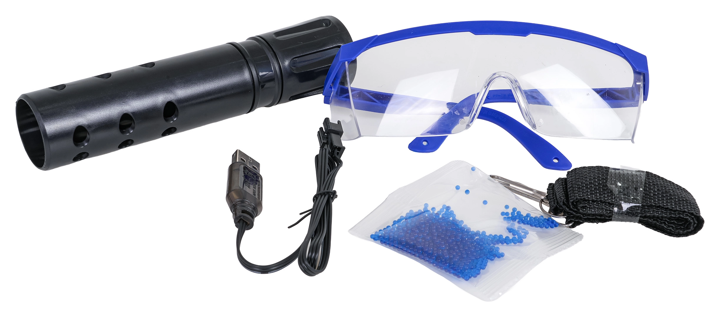 - Blaster M416, zásobník, tlmič, zameriavač, USB kábel, akumulátor 7,4 V, vrecko s cca 500 ks guličiek na prípravu, popruh, ochranné okuliare, návod