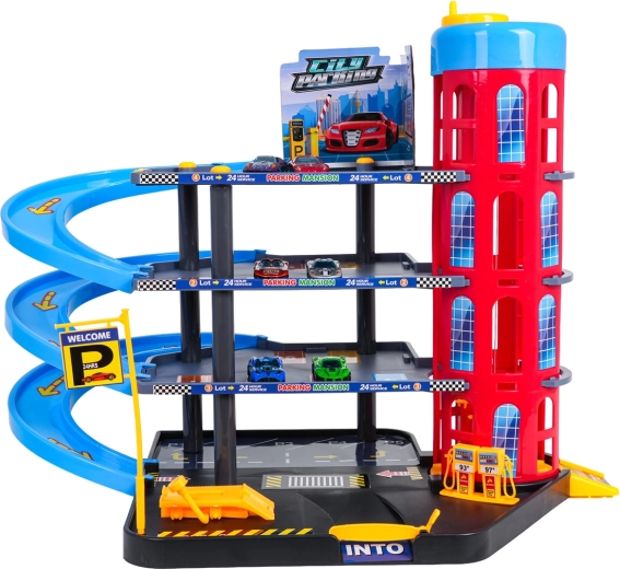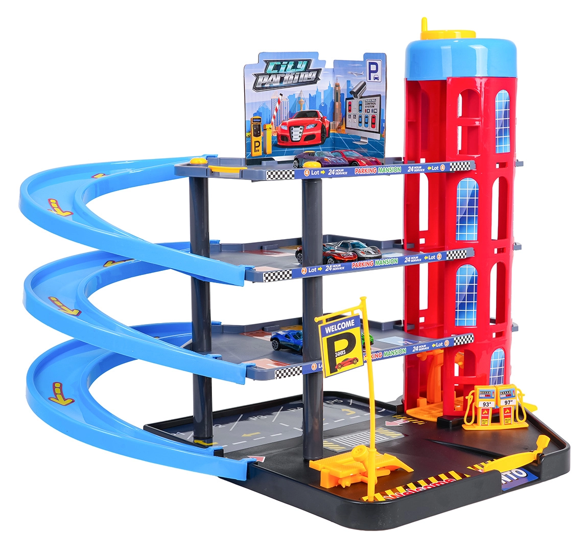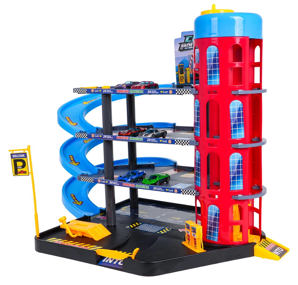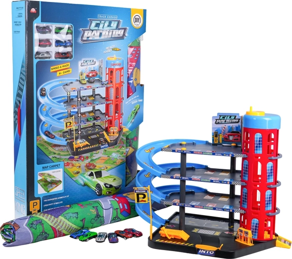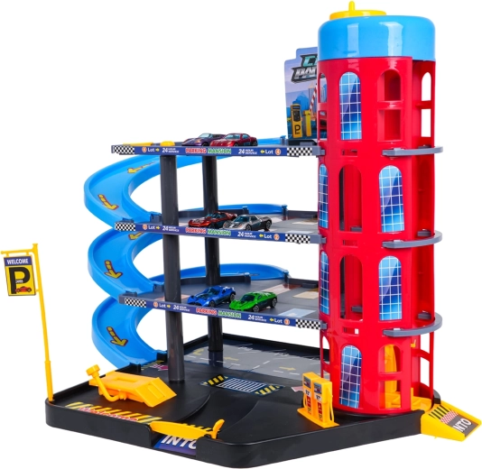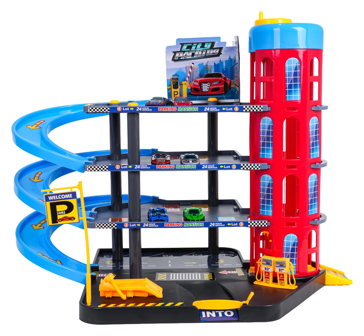 Toto farebné viacposchodové parkovisko kombinuje realistické prvky mesta s dynamickou jazdou. Deti môžu autíčka vyvážať ručne ovládaným výťahom, parkovať na jednotlivých poschodiach a spúšťať ich po špirálových rampách. Integrovaná čerpacia stanica, servisný zdvihák a závorový vjazd podporujú imaginatívnu hru.