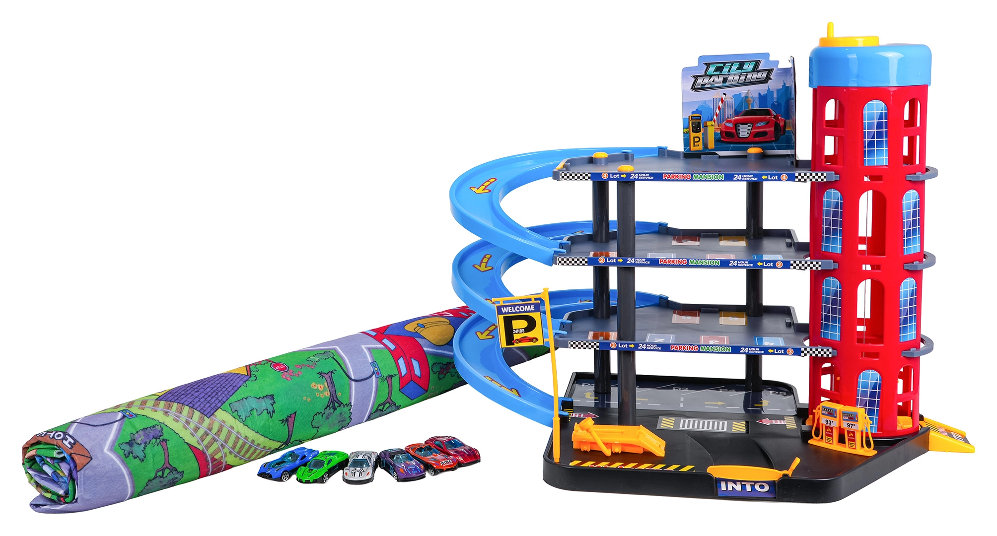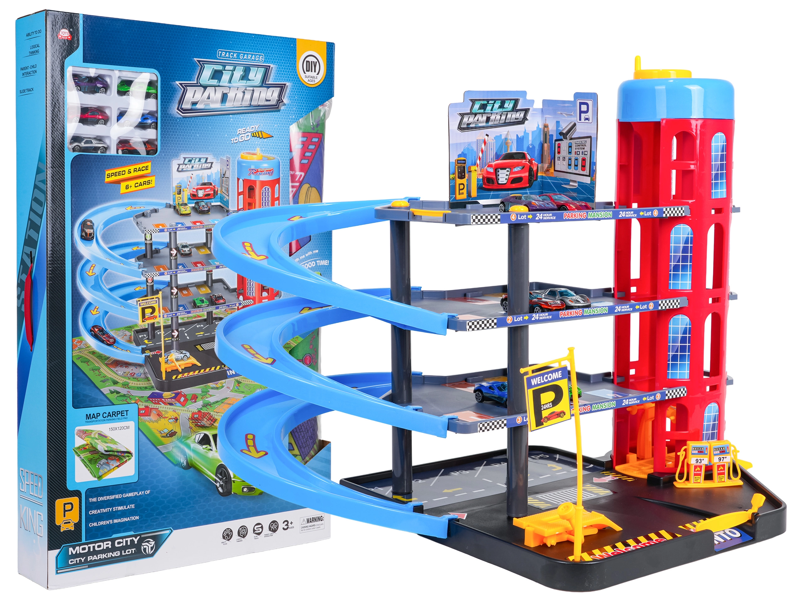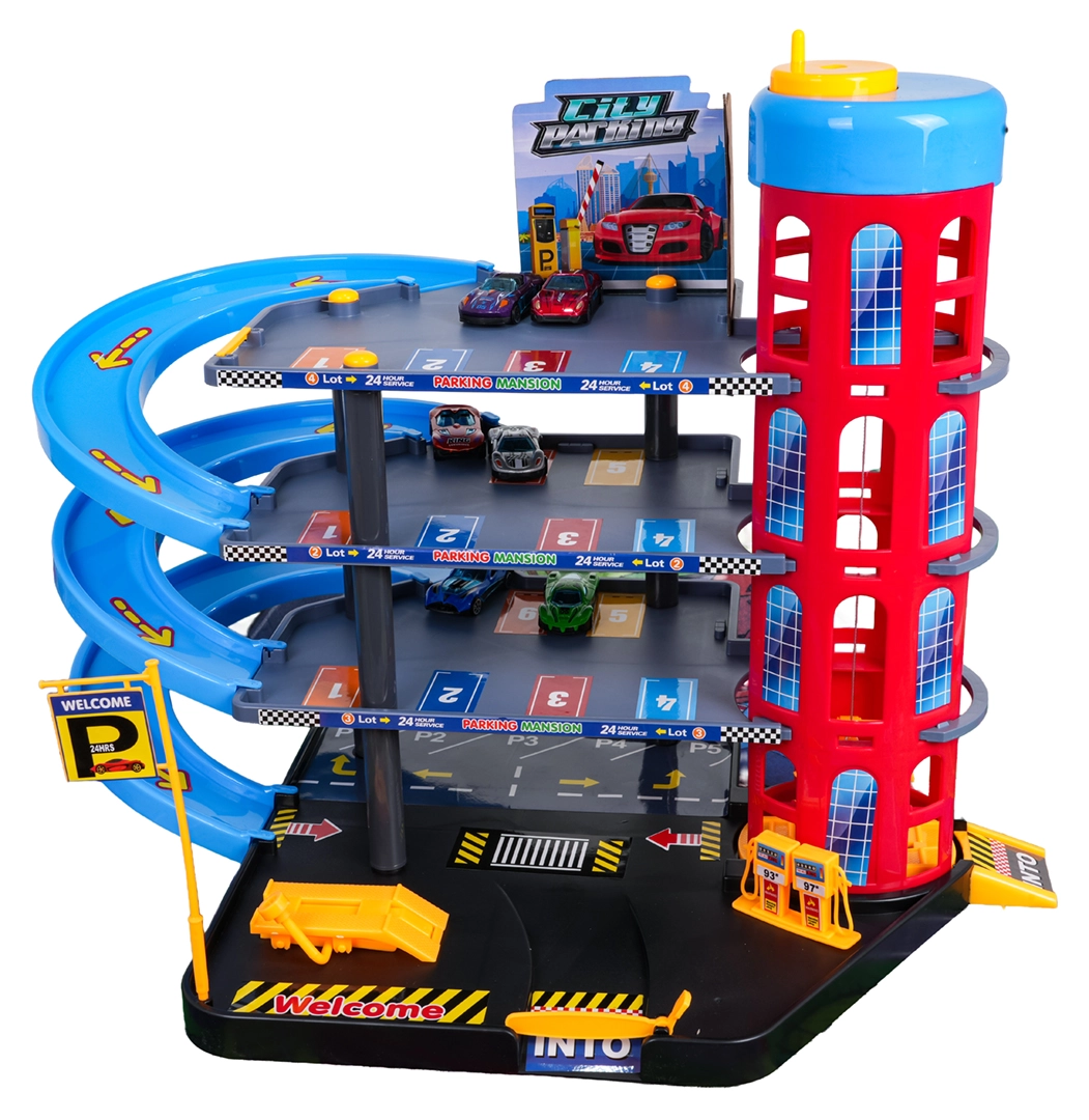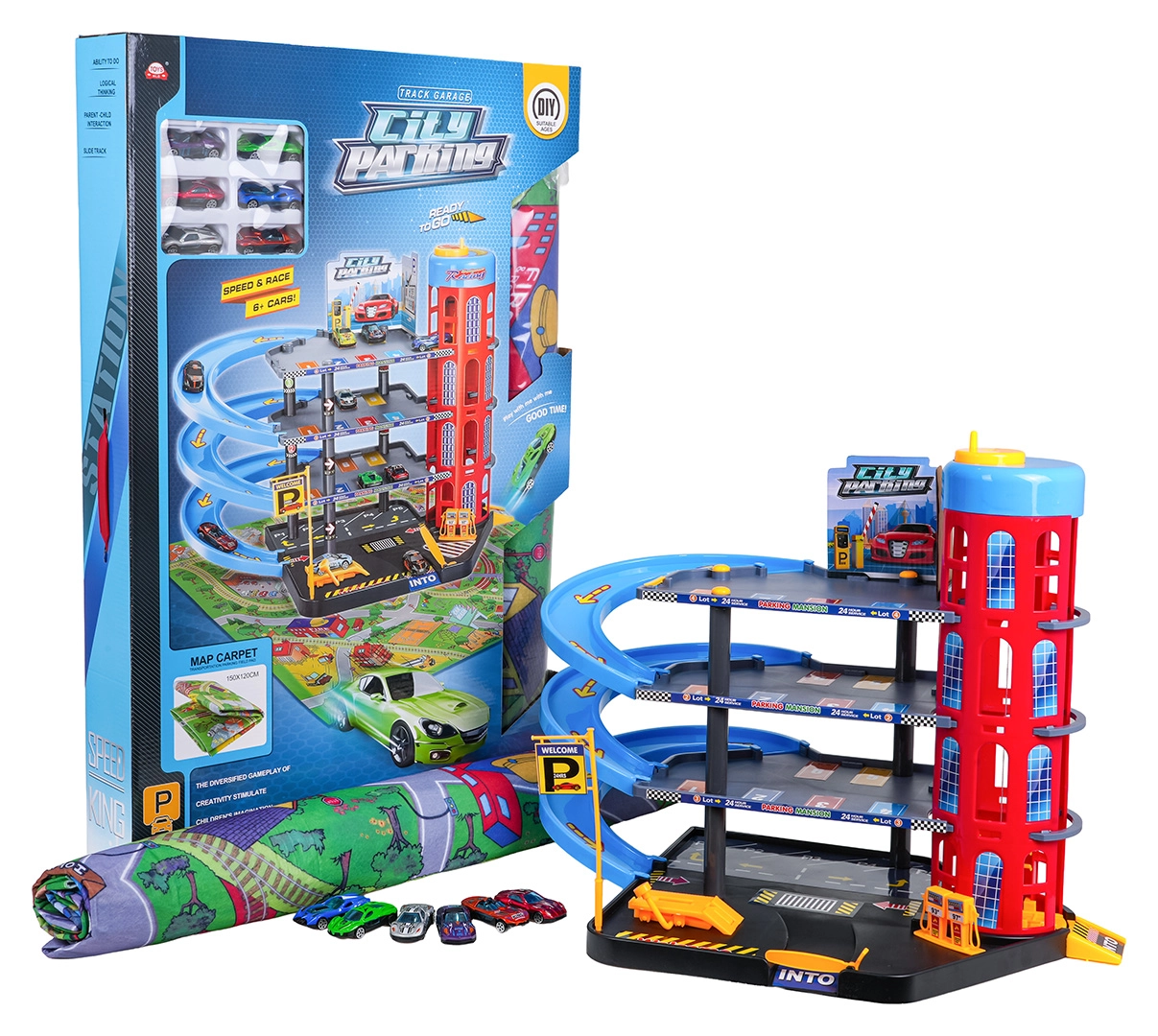 Toto farebné viacposchodové parkovisko kombinuje realistické prvky mesta s dynamickou jazdou. Deti môžu autíčka vyvážať ručne ovládaným výťahom, parkovať na jednotlivých poschodiach a spúšťať ich po špirálových rampách. Integrovaná čerpacia stanica, servisný zdvihák a závorový vjazd podporujú imaginatívnu hru.
