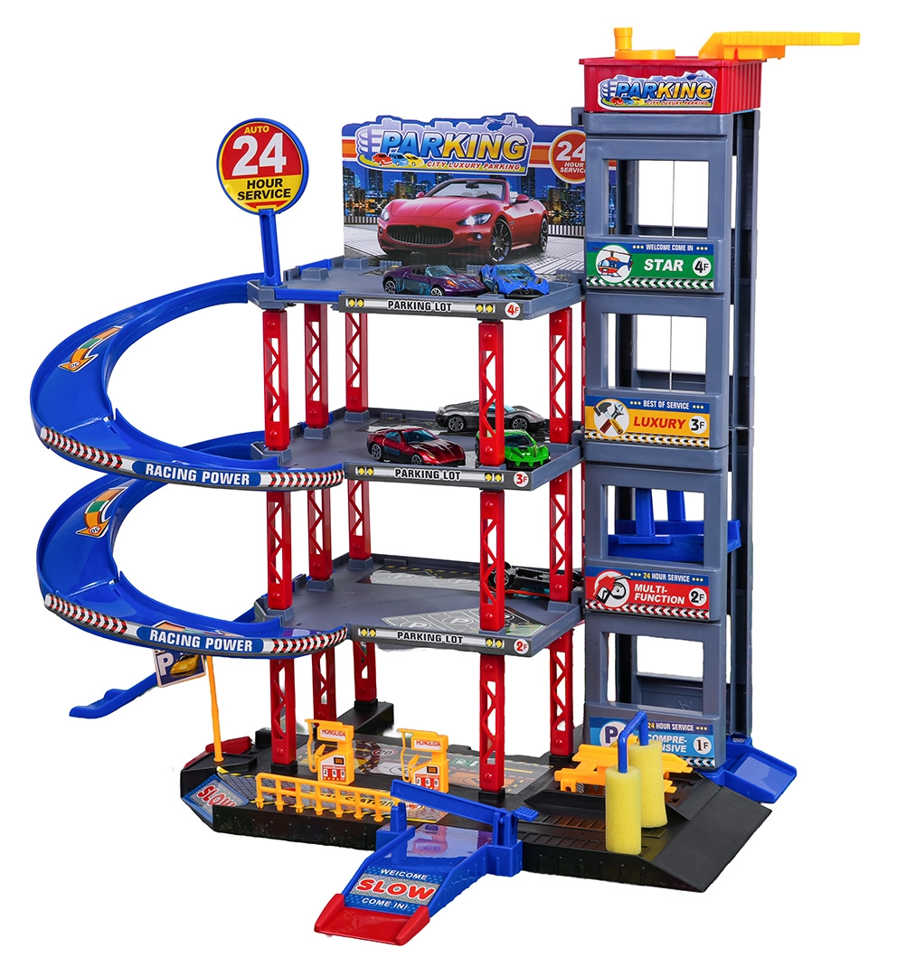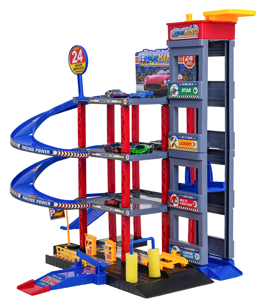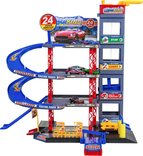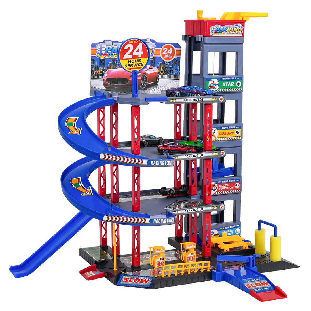 Objavte zábavu pre malých vodičov: robustné viacposchodové parkovisko s manuálnym výťahom, špirálovými rampami a veľkou hernou podložkou s cestami. Súčasťou je 6 kovových autíčok, čerpacia stanica, umývačka, podzemný servis so zdvihákom a zjazdy na preteky pre akčnú hru a rozvoj motoriky.