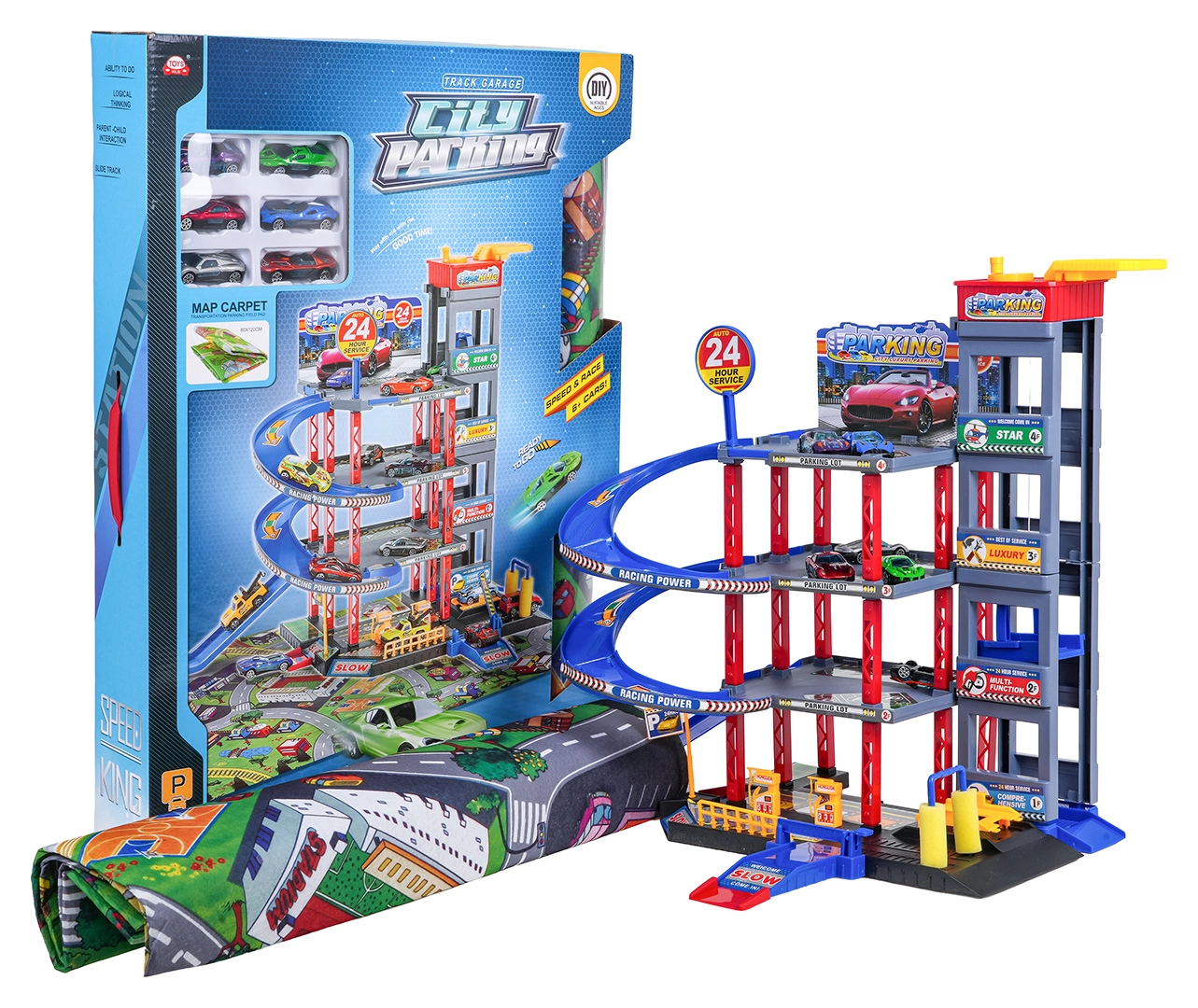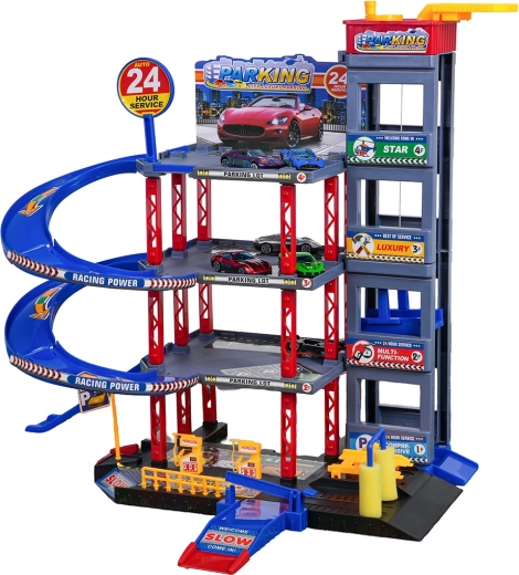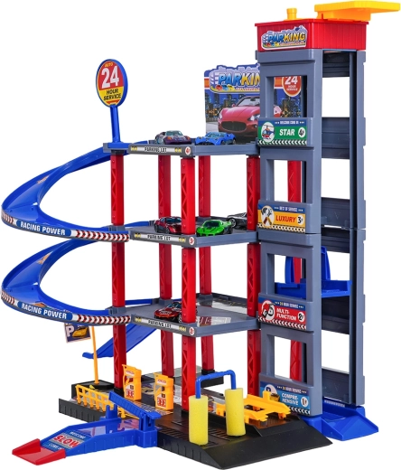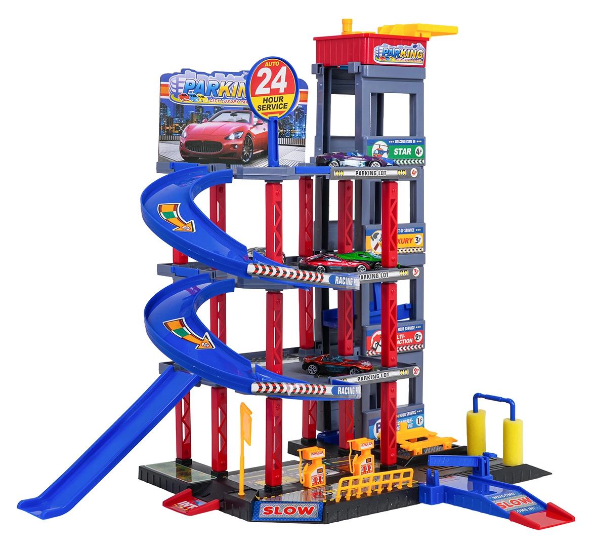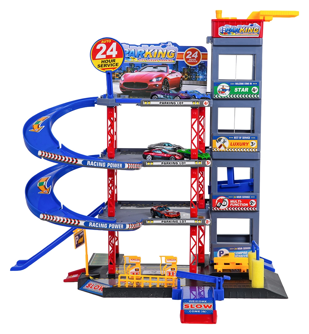 Objavte zábavu pre malých vodičov: robustné viacposchodové parkovisko s manuálnym výťahom, špirálovými rampami a veľkou hernou podložkou s cestami. Súčasťou je 6 kovových autíčok, čerpacia stanica, umývačka, podzemný servis so zdvihákom a zjazdy na preteky pre akčnú hru a rozvoj motoriky.