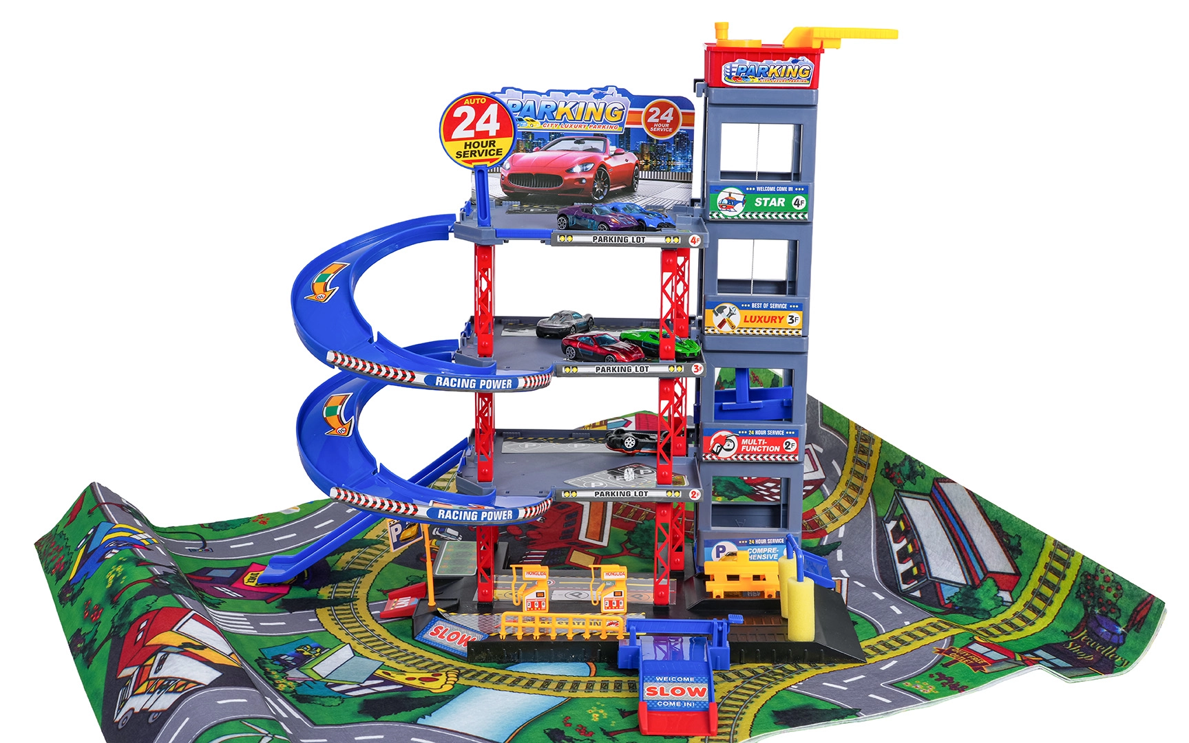 Mega viacúrovňové parkovisko s podložkou a príslušenstvom