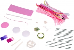 Čo v sade nájdete: farebné kreatívne drôtiky, dekoratívne prvky (koráliky, stuhy), farebný prášok, filc, hubku, pásku, tyčinku lepidla (doplnok – nie je nutné použiť) a obrázkový návod.