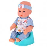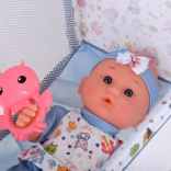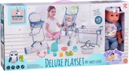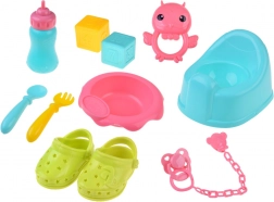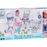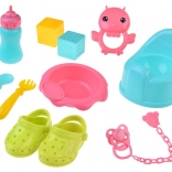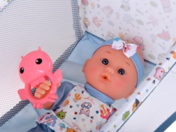 Praktická výbava zahŕňa jedálenský set (misku, príbory a fľaštičku), nočník, cumlík s retiazkou, farebné kocky a hrkálku. Cestovná postieľka s priedušnými sieťovanými bokmi a taškou je ideálna na hranie aj skladovanie. Vďaka bohatej výbave deti ľahko napodobnia skutočnú starostlivosť o bábätko a rozvíjajú komunikáciu aj jemnú motoriku.