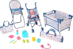 Kompletná herná sada pre malých opatrovateľov: roztomilá bábika bábätko s bohatou výbavou na kŕmenie, prebaľovanie, spánok aj prechádzky. Súčasťou je skladací kočík, jedálenská stolička, cestovná postieľka s taškou, nočník, fľaša, miska s lyžičkou a vidličkou, cumlík na retiazke, hračky a topánočky. Tento set rozvíja empatiu, kreativitu a role-play zručnosti a ponúka hodiny zábavy doma aj na cestách.