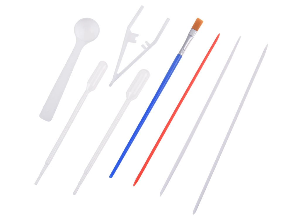 2 pipety/kvapkadlá, lyžička, pinzeta, hrebeň, štetec, špachtľa, ihly na kreslenie