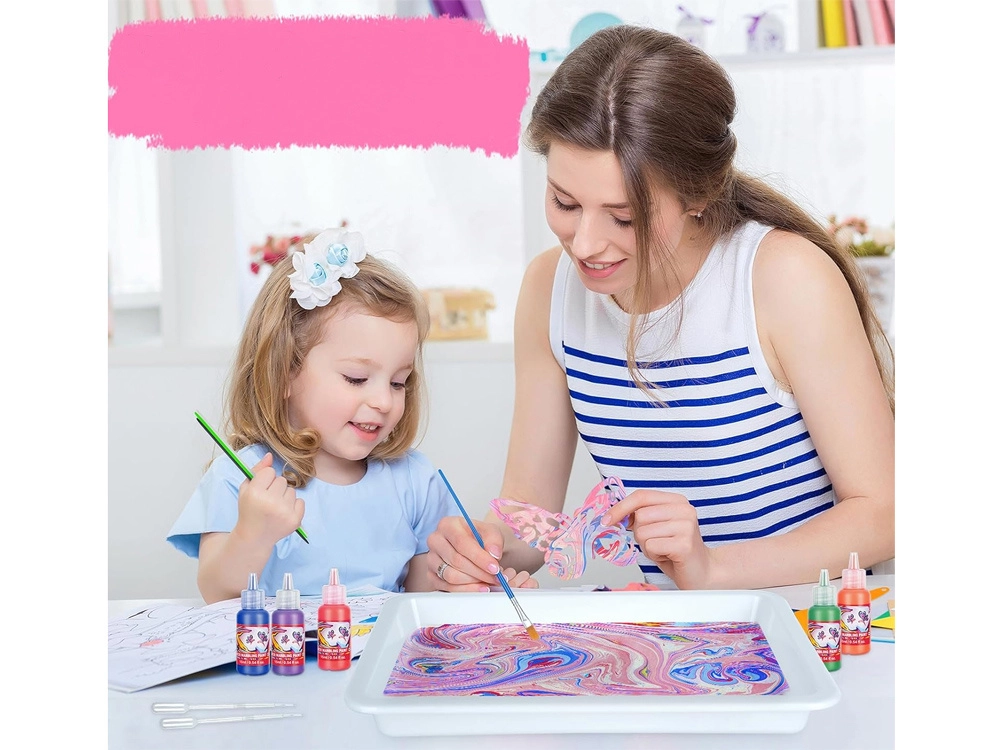 - Živé, miešateľné farby pre efektné mramorovanie.