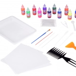 V balení nájdete všetko potrebné: 12 fľaštičiek farieb (16 ml) s presnou špičkou, plastovú vaničku, papiere a sadu nástrojov (kvapkadlá, hrebeň, štetec, špachtľa a i.). Po zmiešaní prášku s vodou vytvoríte gélový kúpeľ, do ktorého kvapkáte farby a modelujete vzor – ten potom jednoducho otlačíte na papier.